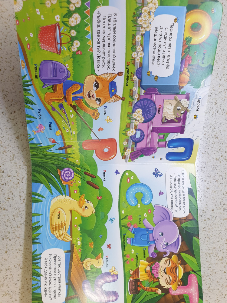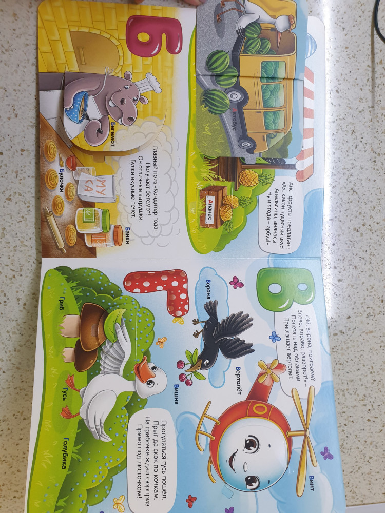 Отличная азбука! Страницы из плотного картона, открывающиеся окошки, яркие красивые рисунки! Ребенок с удовольствием открывает окошки, слушает стишки. покупкой довольны!