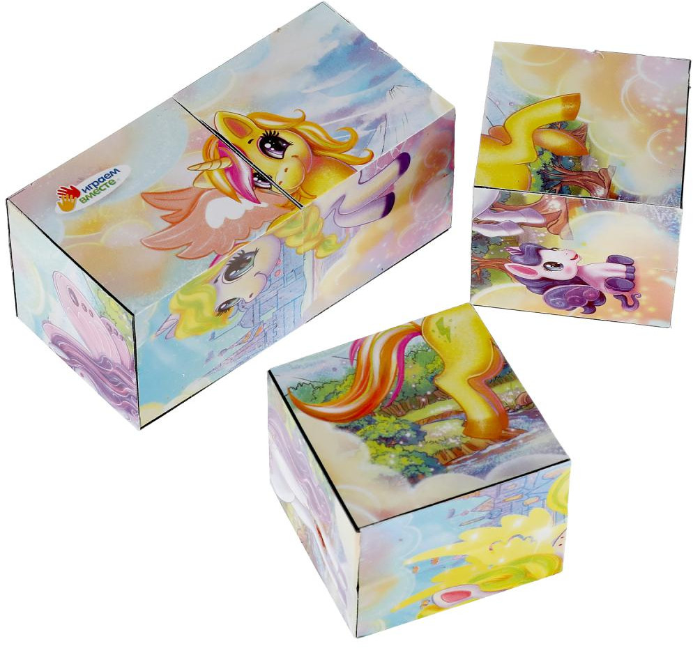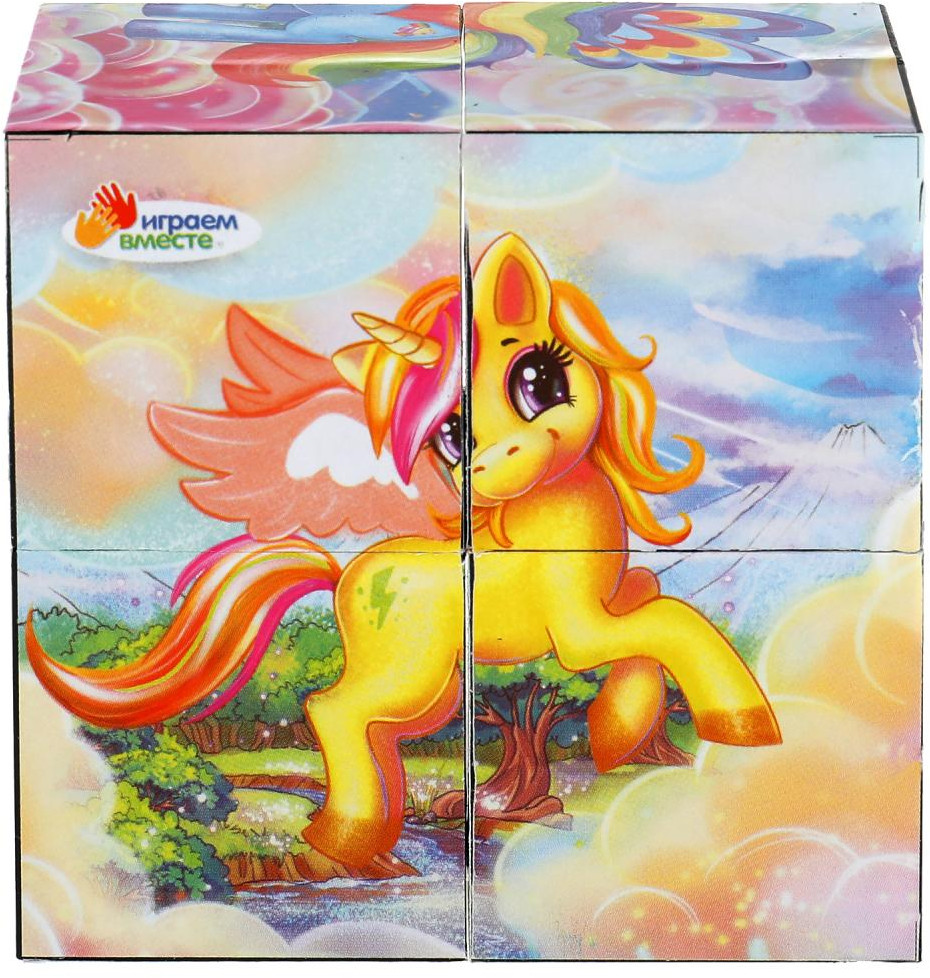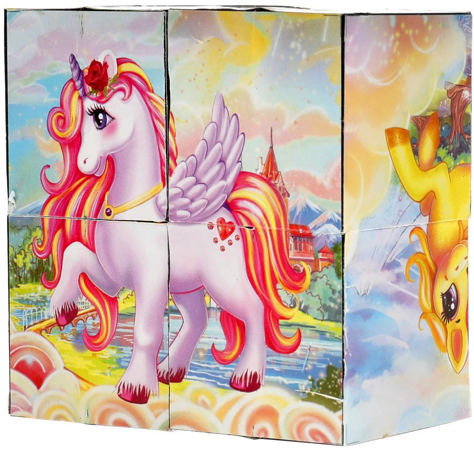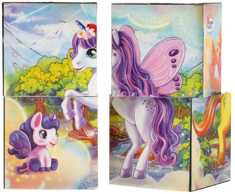 Кубики — одна из первых игрушек малыша, занимающая важное место в его развитии. Из входящих в данный набор кубиков ребёнок с удовольствием будет собирать разные варианты красочных картинок с изображением милых сказочных существ — единорогов.