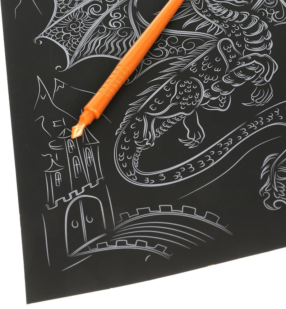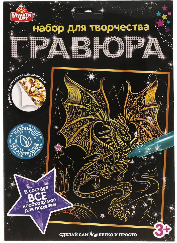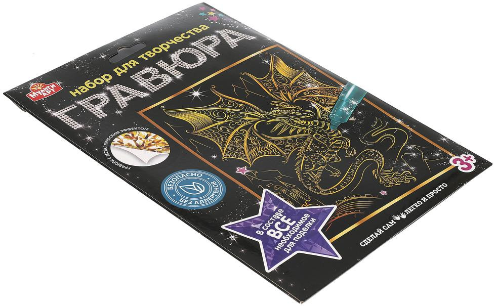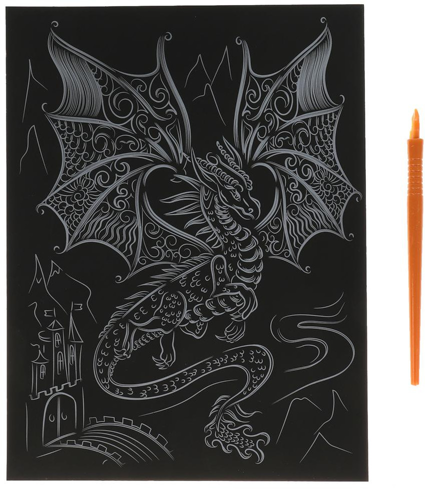 С помощью данного набора юный художник сможет создать эффектную разноцветную картину с металлическим блеском на чёрном фоне. Контур рисунка уже нанесён на основу, остаётся только процарапать изображение специальным штихелем. Готовую поделку можно подарить близким или использовать для украшения интерьера.