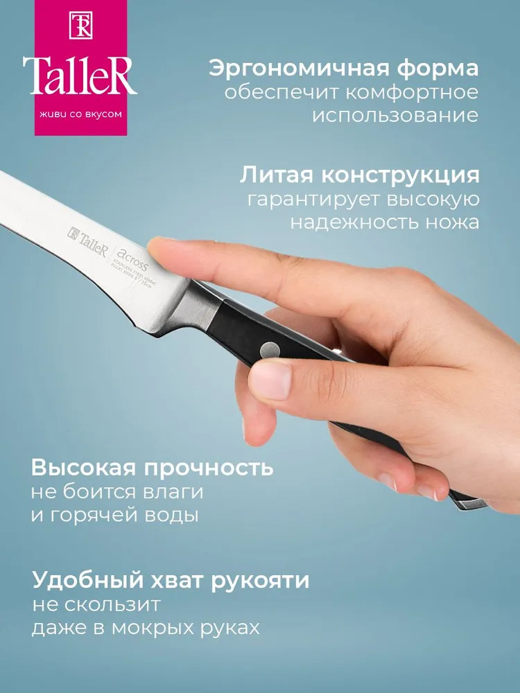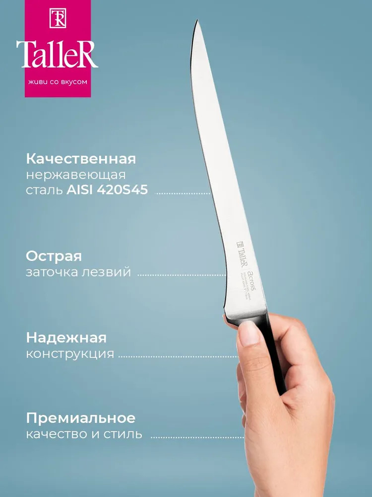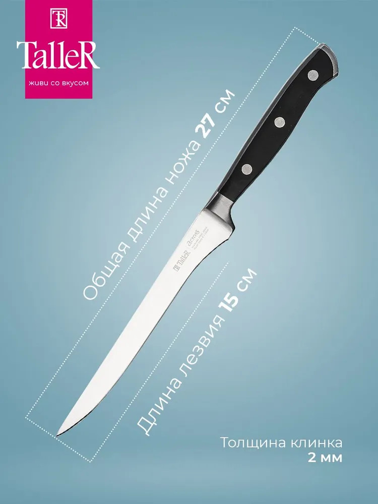 TalleR Нож филейный «Акросс»В данный момент этот товар отсутствует в продаже. Возможно, у нас найдется аналогичный или похожий товар здесь. Серия: Акросс Идеальный нож для нарезки филе. Нож остается острым в течение длительного времени. Подходит для филирования мяса, рыбы. Лезвие ножа сделано из твердой коррозионностойкой стали. Ручка выполнена из ударопрочного пластика. Рекомендуется ручная мойка. |