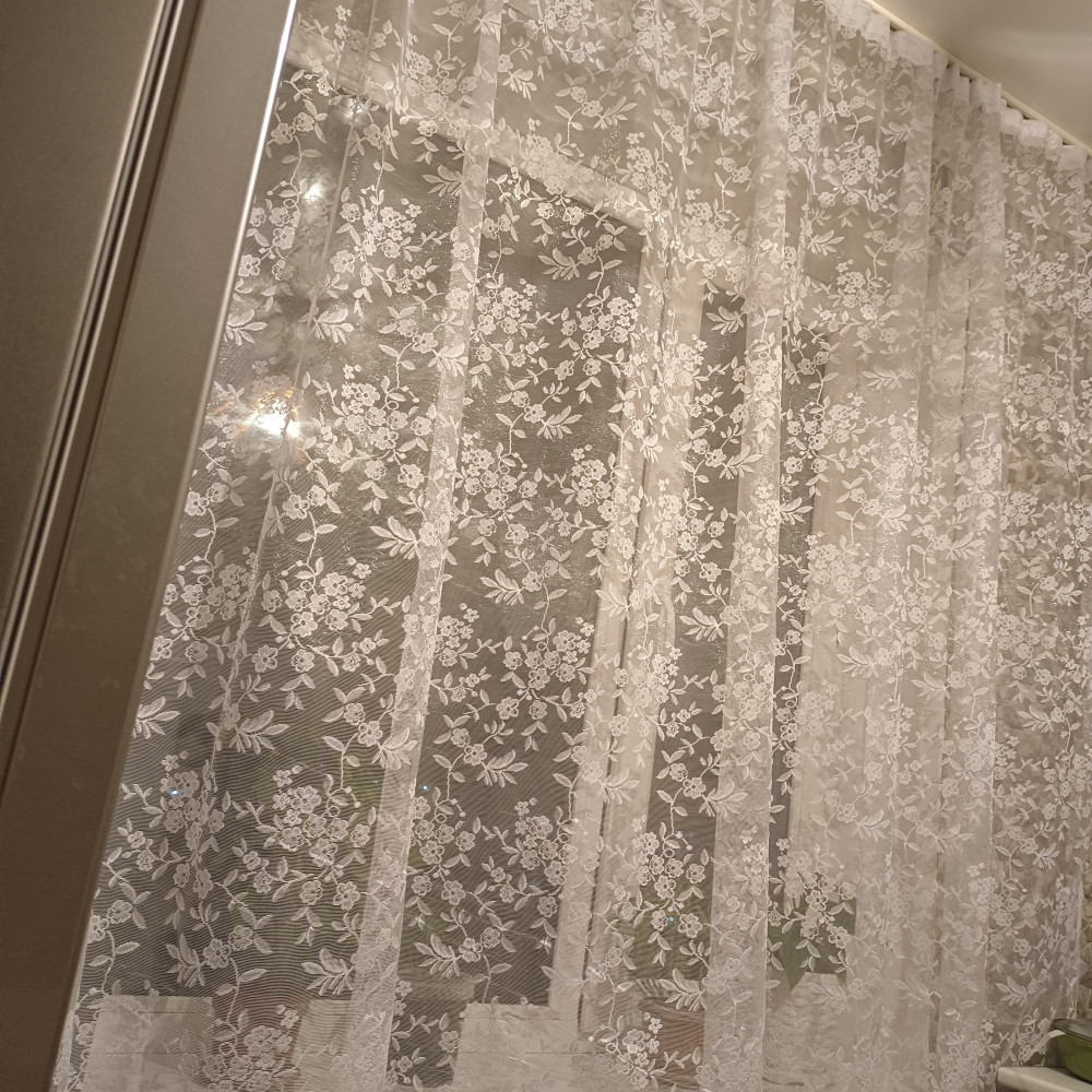Тюль подшита очень не аккуратно, строчки не ровные , волнами идут.И ещё электризуется, трещит.