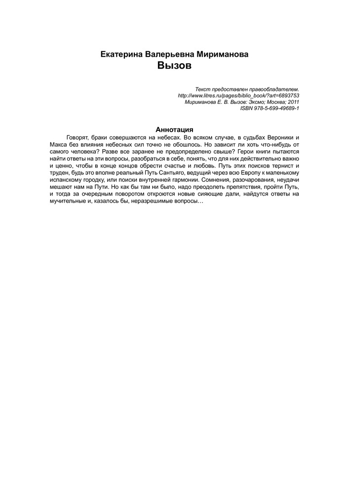 ВызовВ данный момент этот товар отсутствует в продаже. Возможно, у нас найдется аналогичный или похожий товар здесь. Говорят, браки совершаются на небесах. Во всяком случае, в судьбах Вероники и Макса без влияния небесных сил точно не обошлось. Но зависит ли хоть |