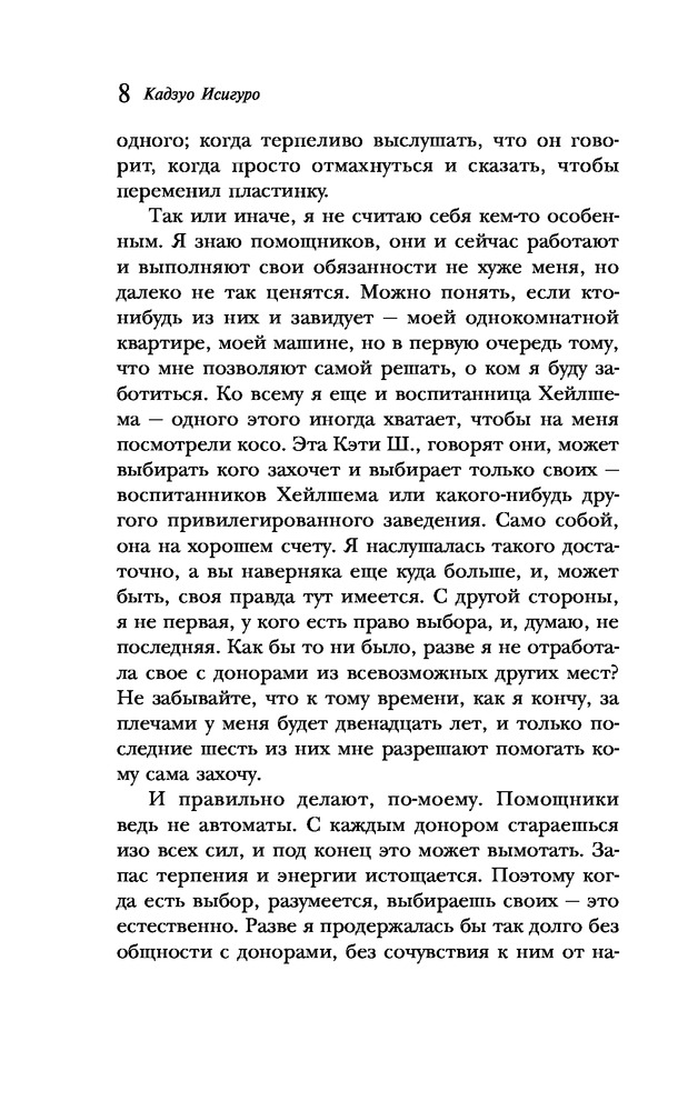 Не знаю даже, то ли слог автора, то ли затянутость всей истории, но книга меня не впечатлила. До самого конца надеялась на что-нибудь, что логично завершило бы всю книгу, но так и не дождалась. В конце и вовсе сидела со смешанными чувствами, если честно. Донорство, о чем вроде как должна быть книга, отодвинулось на второй план, а вот воспоминания героев и их мысли так ни к чему толковому и не привели. Был правда момент, который мне понравился, а именно где рассказывается про детей, их участь, но не знаю, довольно странно все преподнесли в итоге. 3/5 сюжету, книга очень хорошего качества)