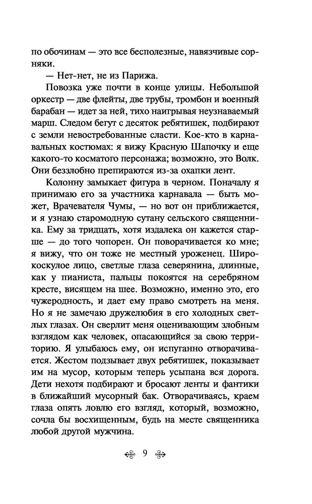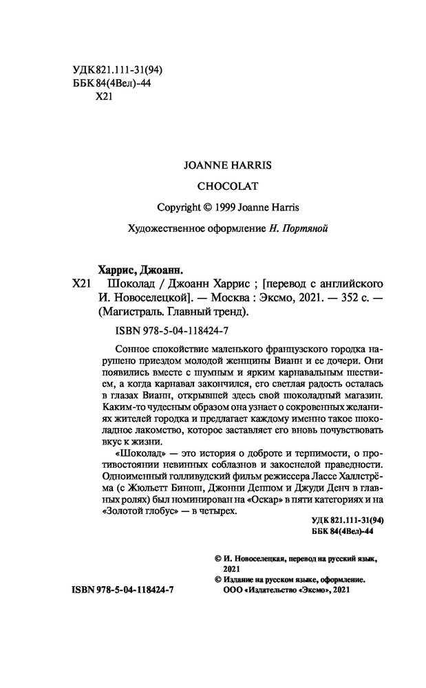 Книга ну очень интересна при том что перечитывал ее во 2 раз( в первый раз было другое издание и книга казалась скучной). Обложка у книги просто идеальна, да, мягкая обложка, но очень красивая с присутствием цитаты сзади. У Джоанн Харрис простой , легкий, но в то же время очень интересный слог. Книга читается легко, так и чувствуются ароматы шоколада, сладостей, выпечки и других блюд. В книге очень много персонажей , они заставляют задуматься о человеческой сущности. Понимаешь лживость и лицемерие людей , а также церковную власть, которую толком никто не почитает, но ходит служит ей и ведет себя юродиво. Книга цепляет за чувства, полна эмоциями и красотой. Рекомендую прочитать всем. Также в серии есть продолжения этой тетрологии.