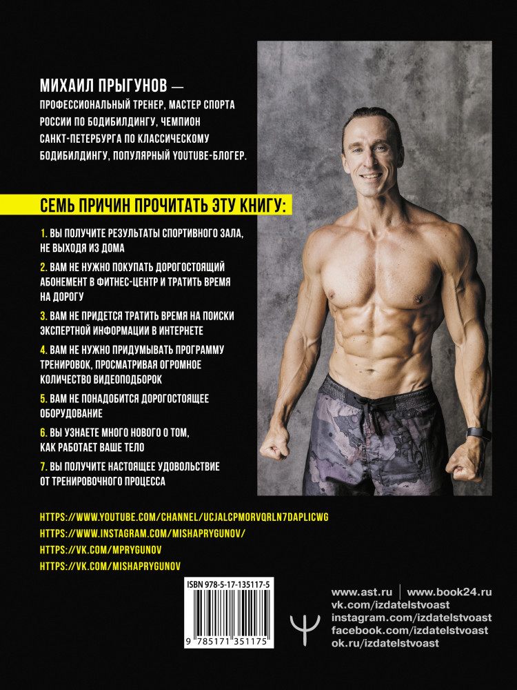 В данный момент этот товар отсутствует в продаже. Возможно, у нас найдется аналогичный или похожий товар здесь. Серия: Фитнес Рунета Книга, которую вы держите в руках, — актуальный и подробный гайд по домашним тренировкам. Автор книги, Михаил Прыгунов — профессиональный тренер, мастер спорта России по бодибилдингу, чемпион Санкт-Петербурга по классическому бодибилдингу, а также популярный YouTube-блогер — написал эту книгу специально для того, чтобы ваше тело сказало вам спасибо!