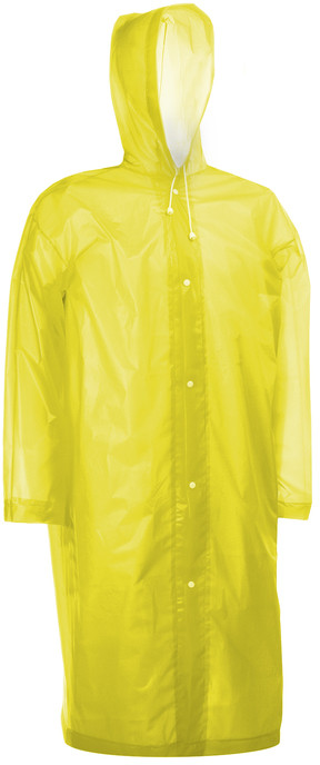 Длинный, широкий, плотный, на кнопочках (сильно дергать нельзя), на капюшоне шнуровка. Удобный защитный плащ от дождя.