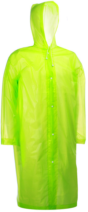 Длинный, широкий, плотный, на кнопочках (сильно дергать нельзя), на капюшоне шнуровка. Удобный защитный плащ от дождя.