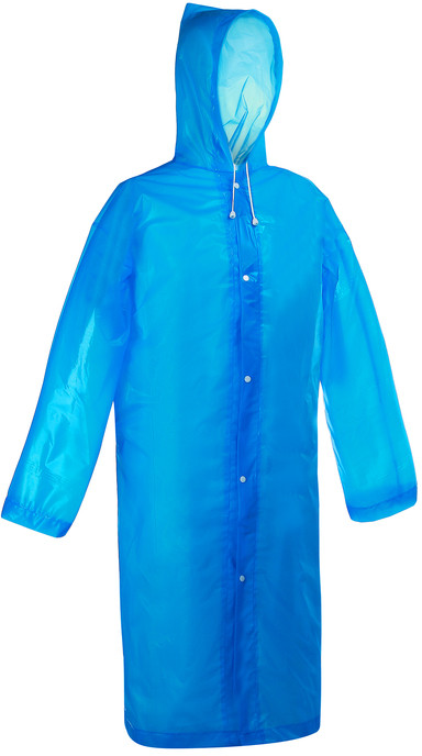 Длинный, широкий, плотный, на кнопочках (сильно дергать нельзя), на капюшоне шнуровка. Удобный защитный плащ от дождя.