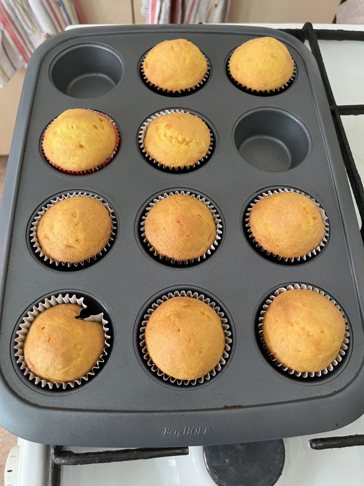 Купила кекс лимонный. Всё получилось согласно рецепта. Выпекала 25 минут при температуре 220* на верхнем уровне, чтобы низ не подгорел в бумажных формочках. Всё пропеклось отлично. Получилось 12 кексов. Вкусно.