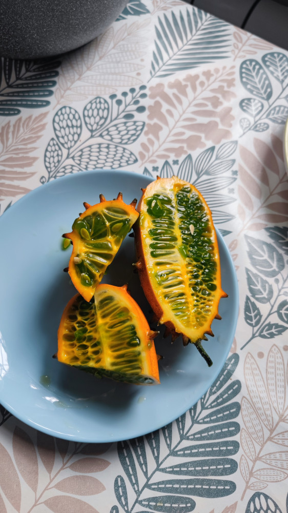 Взошли все семечки, сажали в теплице. Посажены были видимо слишком тесно, плюс рядом были другие огурцы, поэтому им не хватало света, созрели и стали оранжевыми плоды, которые были в самом верху теплицы. На вкус зелёные плоды похожи на обычные огурцы, спелый больше похож на фрукт, сладкий вкус.