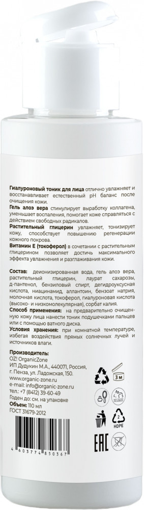 Organic Zone Тоник для лица гиалуроновый с алоэ вера и глицерином+27 успокаивает кожу увлажняет нанесению крема