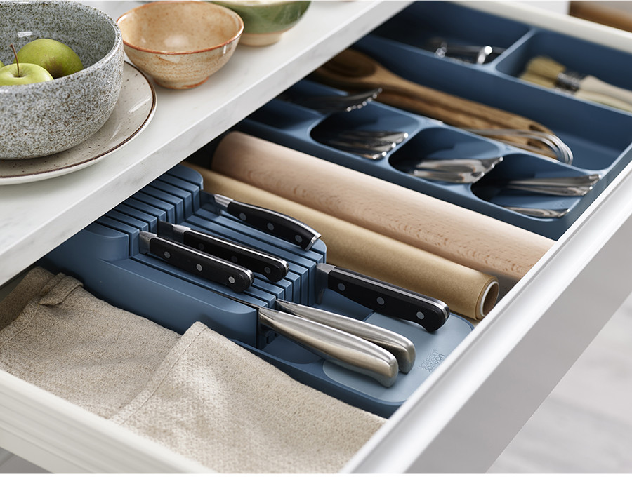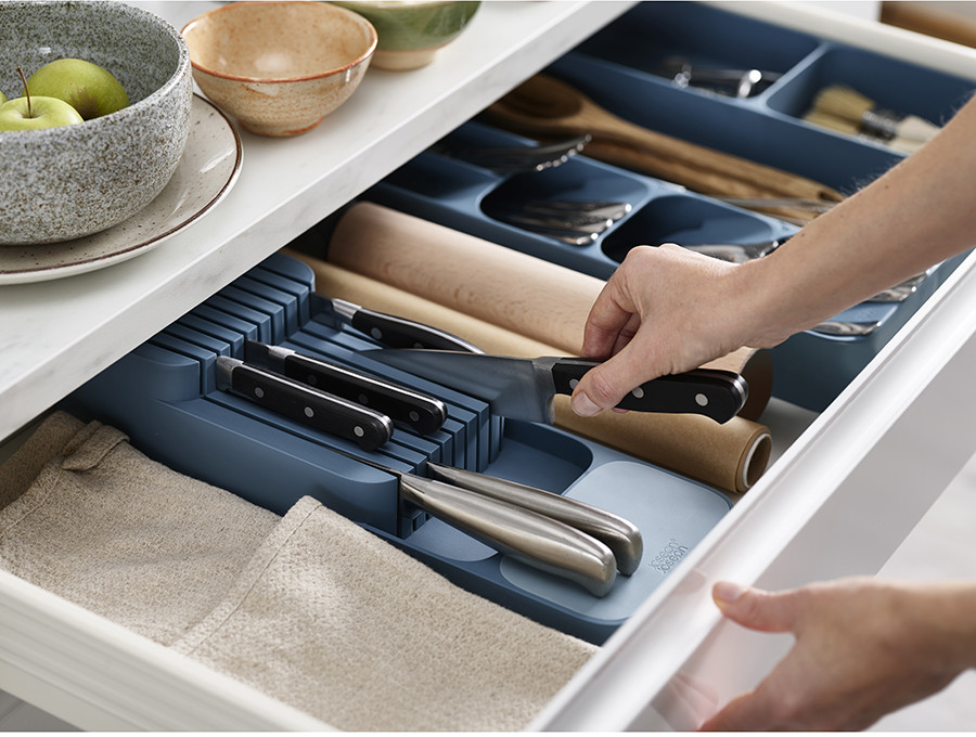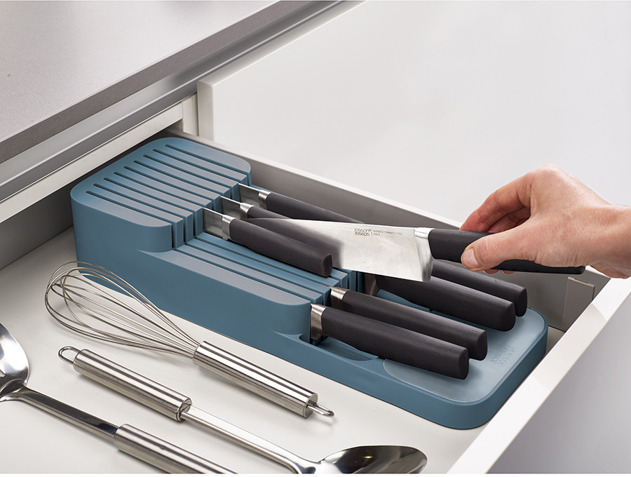 Если ящик немного с наклоном открывается, то ножи выпадают, либо под низ что-то подкладывать нужно, либо располагать перпендикулярно открыванию.