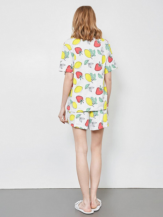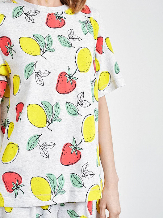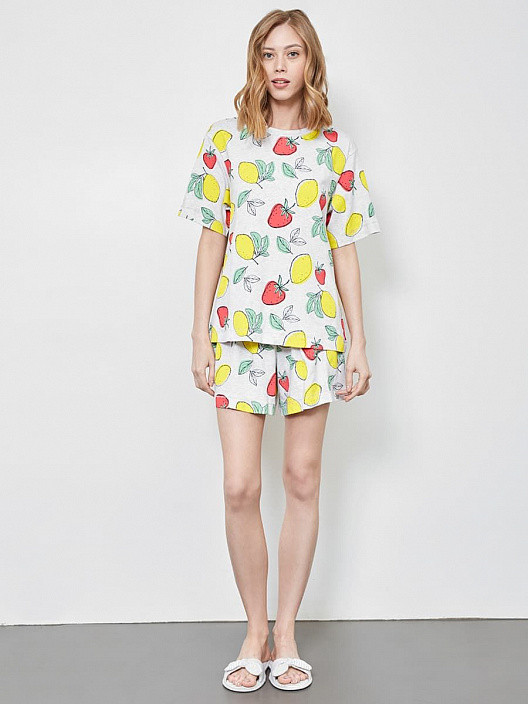 Пижама яркая летняя, после стирки не села, не деформировалась. Гладится хорошо, к утюгу не прилипает. Единственный недостаток - несоответствие в стиле ежду верхом и низом. Верх - глухая широкая майка с рукавами до локтя. логично было бы к ней сшить низ типа бермуды. А здесь шорты-бикини, к которым был бы логичен топ, что было бы идеальным комплектом на жаркое лето. Но это придирки уже.