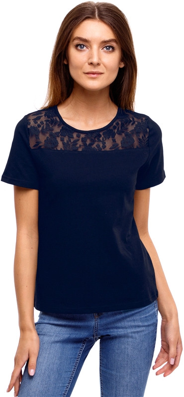 Футболка красивая, цвет темно синий. Пошита хорошо. Брала свой размер, подошёл. Носить можно с юбками любого цвета.