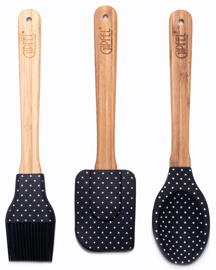 Яркий и необыкновенный набор лопаток для кухни впишется в интерьер кухни, оформленной в стиле кантри. Предметы выполнены из бамбука и красного силикона в белый горошек. Набор аксессуаров состоит из трех предметов: кисточки, лопатки и ложки. Они помогут в приготовлении блюд — от тушеных овощей и румяных ребрышек до нежнейших воздушных десертов. Поскольку рабочая часть выполнена из силикона, она не поцарапает антипригарное покрытие сковородки или формы для выпечки. Материал термоустойчивый, не выделяет вредных соединений и безопасен даже для детской кухни. Ручка из бамбука не расплавится от горячей кастрюли и сохранит прочность в течение интенсивной эксплуатации. Аксессуары не требуют ухода, легко моются губкой и средством для мытья посуды. Допускается чистка в посудомоечной машине.