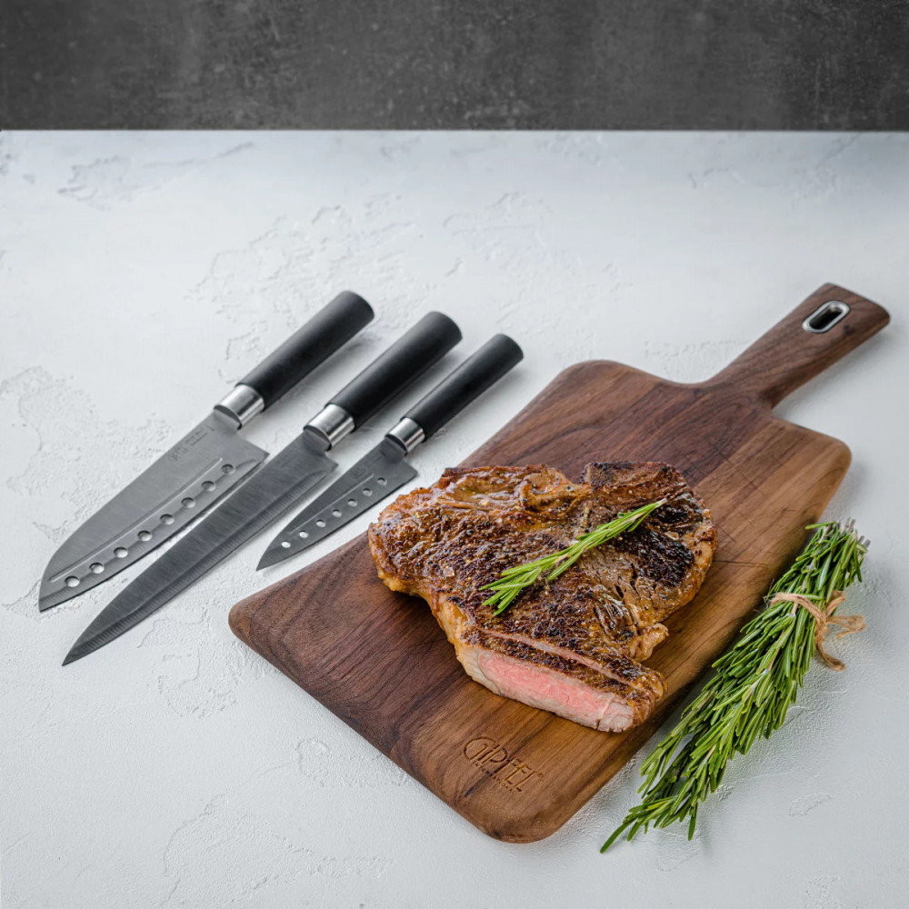 Gipfel Набор ножей «Japanese»В данный момент этот товар отсутствует в продаже. Возможно, у нас найдется аналогичный или похожий товар здесь. Серия: Japanese Набор ножей для шеф-повара станет незаменимым помощником для каждой хозяйки. Дизайн и утонченный внешний вид будут украшением на кухне. Для их изготовления используется нержавеющая легированная сталь, благодаря чему лезвие надолго сохраняется острым, не подвергается коррозии. Такие ножи просты, удобны и практичны в процессе эксплуатации. Эргономичные рукоятки, выполненные из прочного пластика, позволят удобно фиксировать нож в руке, он будет надежно зажат, что исключает травмирование по время работы. Набор упакован в деревянную коробку, благодаря чему будет подарком на торжество. |
