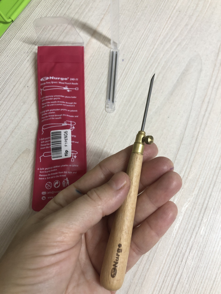 Деревянная ручка. В наборе три иглы разной толщины и нитковдеватель.