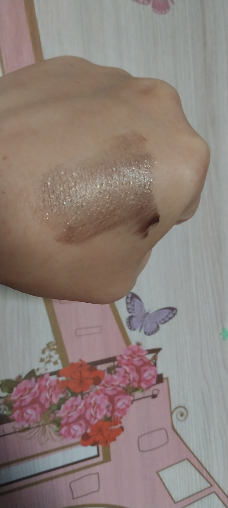 оттенок с легкими блестками, можно и как для вечернего макияжа использовать, текстура хорошая, ложится равномерно, цвет очень красивый