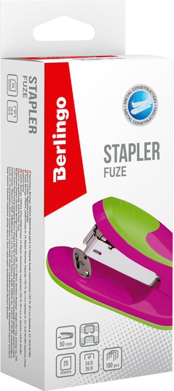 💳 Оплатить за товар можно при получении 🇰🇿 Есть бесплатная доставка по Казахстану 🎁 Копите бонусы с каждой покупки Серия: Fuze Степлер Berlingo «Fuze» выполнен в сочетании ярких неоновых цветов, подходит для ежедневного использования. У данной модели пластиковый корпус с антискользящими резиновыми вставками и металлический механизм. Вмещает 100 скоб размером № 24/6, 26/6 , имеет 2 типа скрепления. |