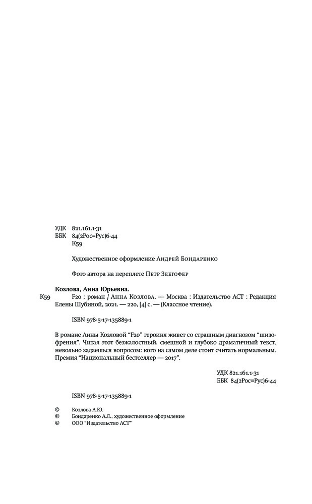 💳 Оплатить за товар можно при получении 🇰🇿 Есть бесплатная доставка по Казахстану 🎁 Копите бонусы с каждой покупки Серия: Классное чтение В романе Анны Козловой «F20» героиня живет со страшным диагнозом «шизофрения». Читая этот безжалостный, смешной и глубоко драматичный текст, невольно задаешься вопросом: кого на самом деле стоит считать нормальным. Премия «Национальный бестселлер — 2017». |