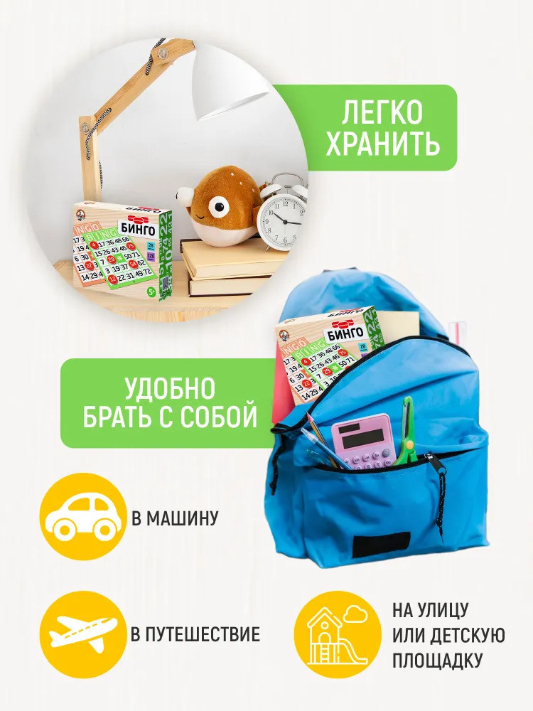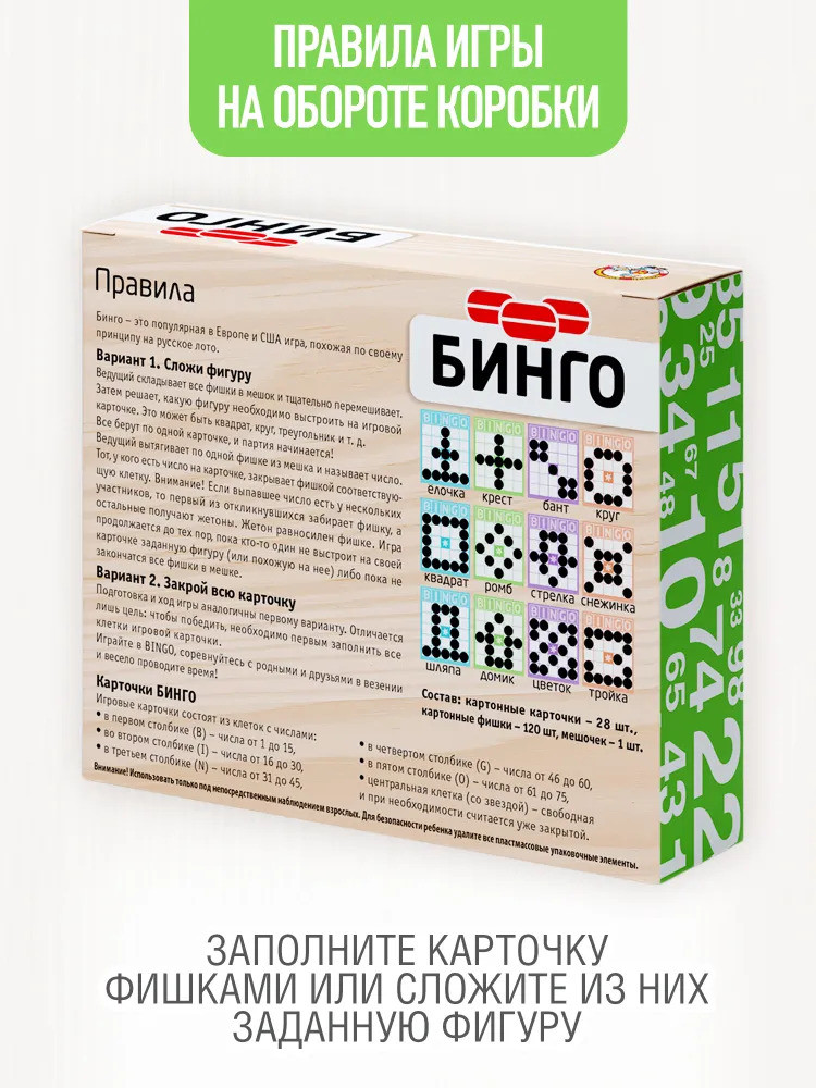 💳 Оплатить за товар можно при получении 🇰🇿 Есть бесплатная доставка по Казахстану от 1 дня 🎁 Копите бонусы с каждой покупки Проведи время с друзьями за легендарной игрой «Бинго» от «Десятого королевства»! Играйте в «Бинго» вместе с детьми. Эта игра популярна, похожая на русское лото. Выбирай один из двух вариантов ведения игры. Закрой свою игровую карточку или сложи фигуру. |