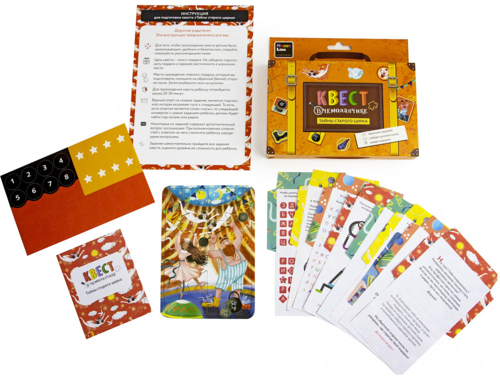 Разгадывайте загадки цирка вместе с набором из серии «Квест в чемоданчике» и наполните досуг вашего ребёнка увлекательными моментами! Интересные задания, шифры, загадки, поиск подсказок и много адреналина ждут юных любителей цирка! А для того чтобы найти подарок, им придется побывать за кулисами, познакомиться с труппой, узнать секреты цирковых номеров и выполнить ещё ряд оригинальных заданий.