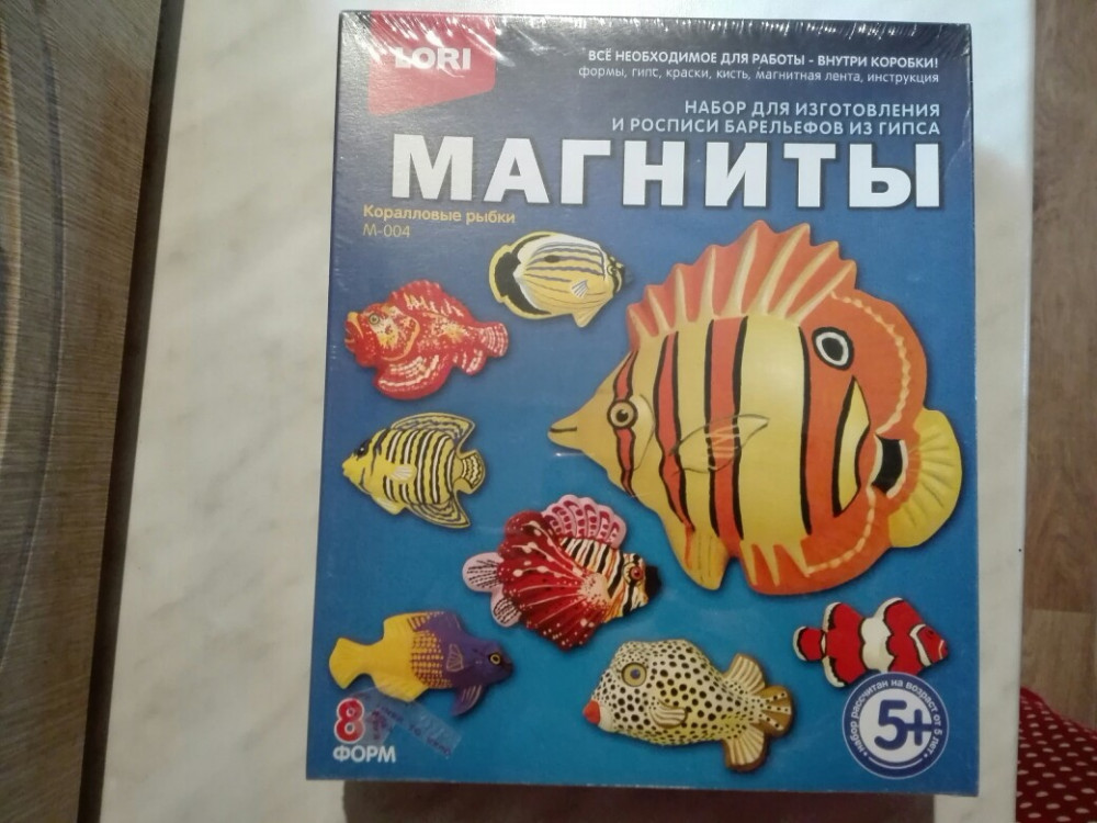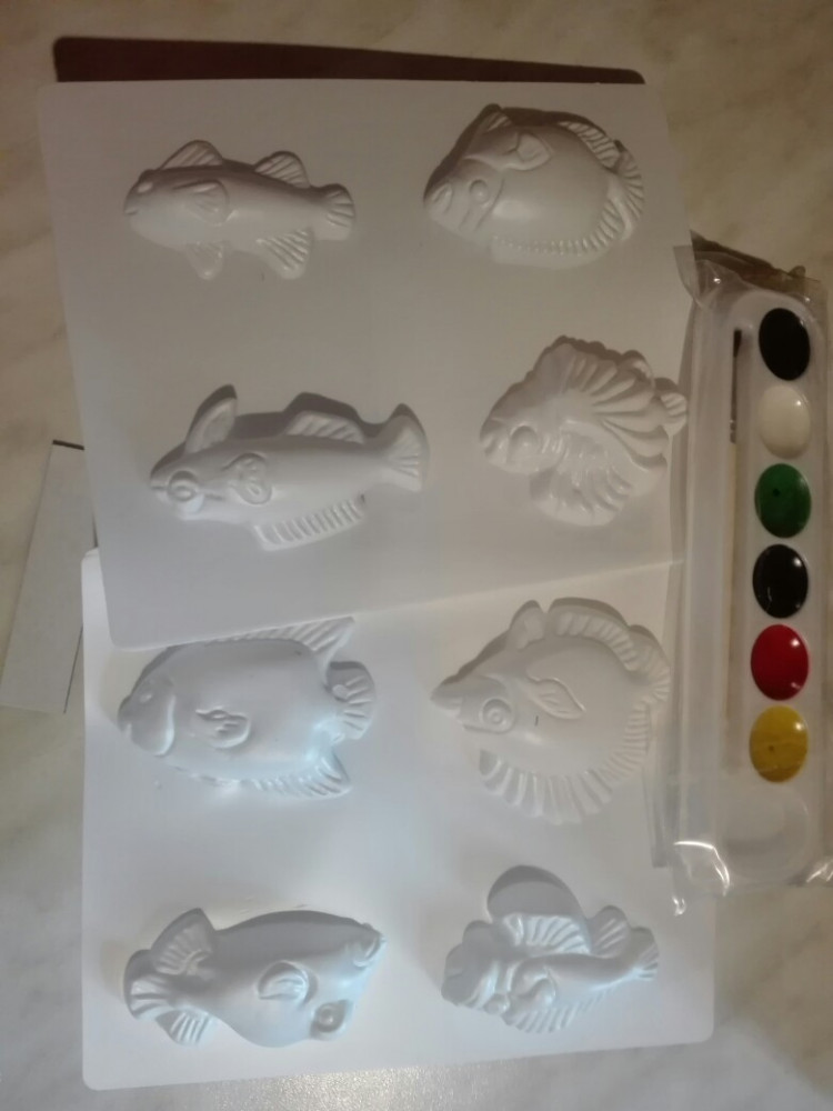 Гипс быстро застывает , легко вынимается из форм, красится тоже очень легко, покрываешь лаком и смотрится просто супер, но есть одно немаловажное НО магниты входившие в состав абсолютно не держат поделки на холодильнике. Всего две тонюсенькие полоски магнитной ленты на восемь не бумажных рыбок, все равно что этих магнитов и нет. Так что при покупке этого набора приобретайте заранее нормальные магниты которые будут держаться.