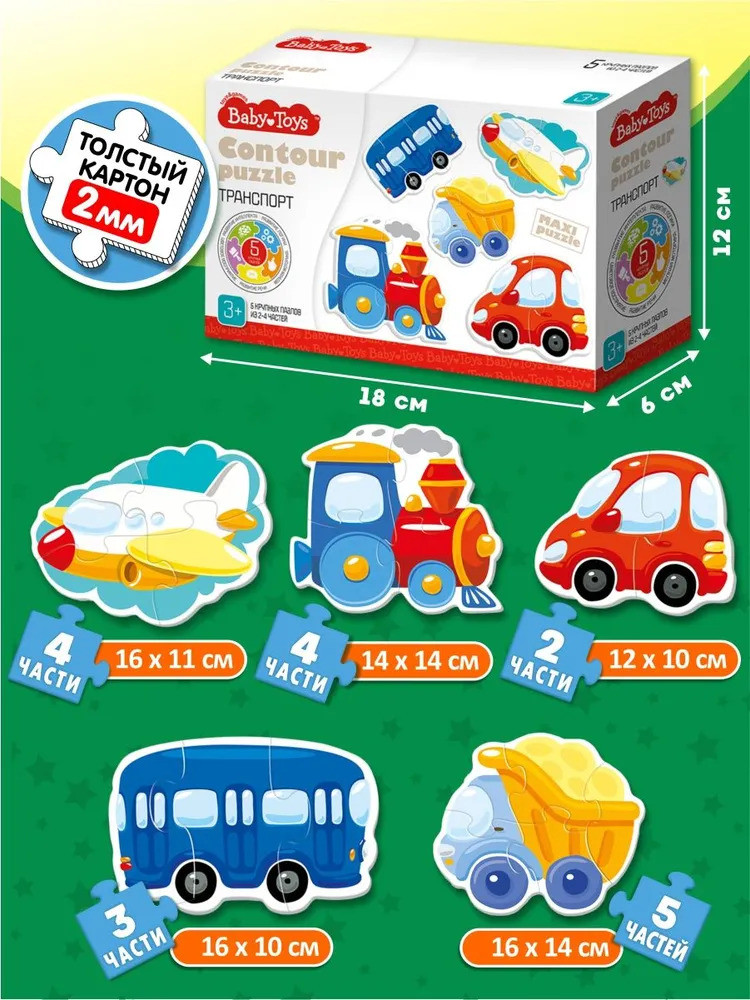 💳 Оплатить за товар можно при получении 🇰🇿 Есть бесплатная доставка по Казахстану от 1 дня 🎁 Копите бонусы с каждой покупки Тренируйте логику и мелкую моторику с первыми пазлами для вашего малыша — контурными пазлами «Транспорт» от Baby Toys! Собирайте фигурки транспортных средств, состоящие из крупных деталей с уникальным пазловым замком! С набором контурных пазлов «Транспорт» малыш сможет собрать фигурки 5 транспортных средств: автобус, паровоз, автомобиль, самолёт и грузовик. Каждая фигурка состоит из нескольких частей (от 2 до 5), что позволяет разбить игру на уровни сложности, собирая пазлы от самых простых к более тяжёлым. |