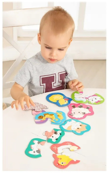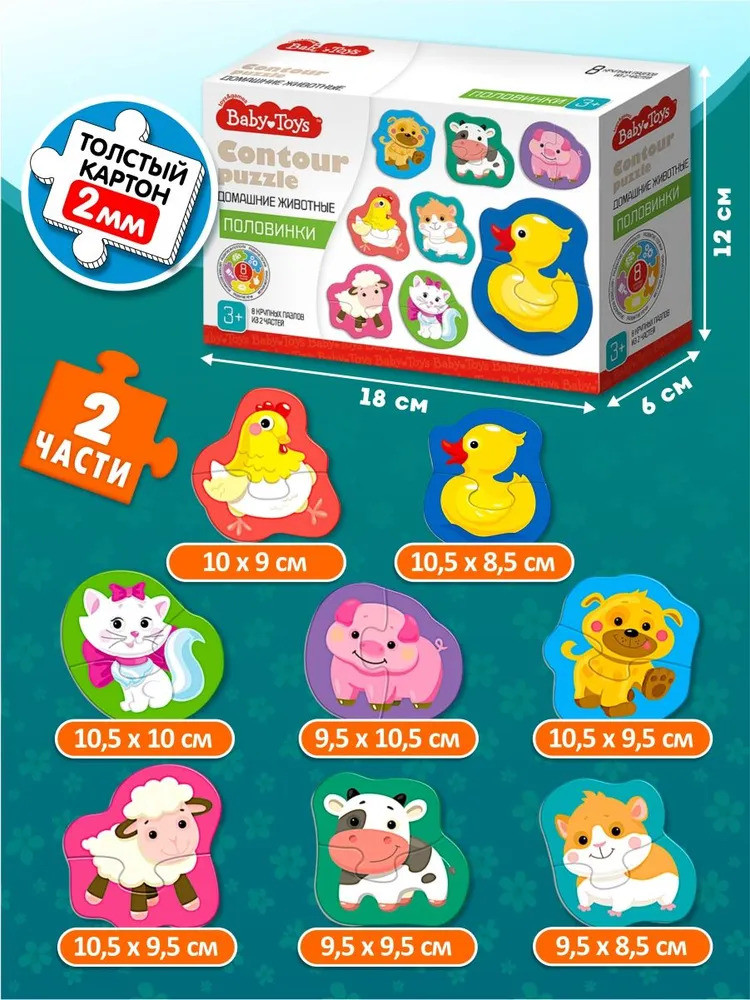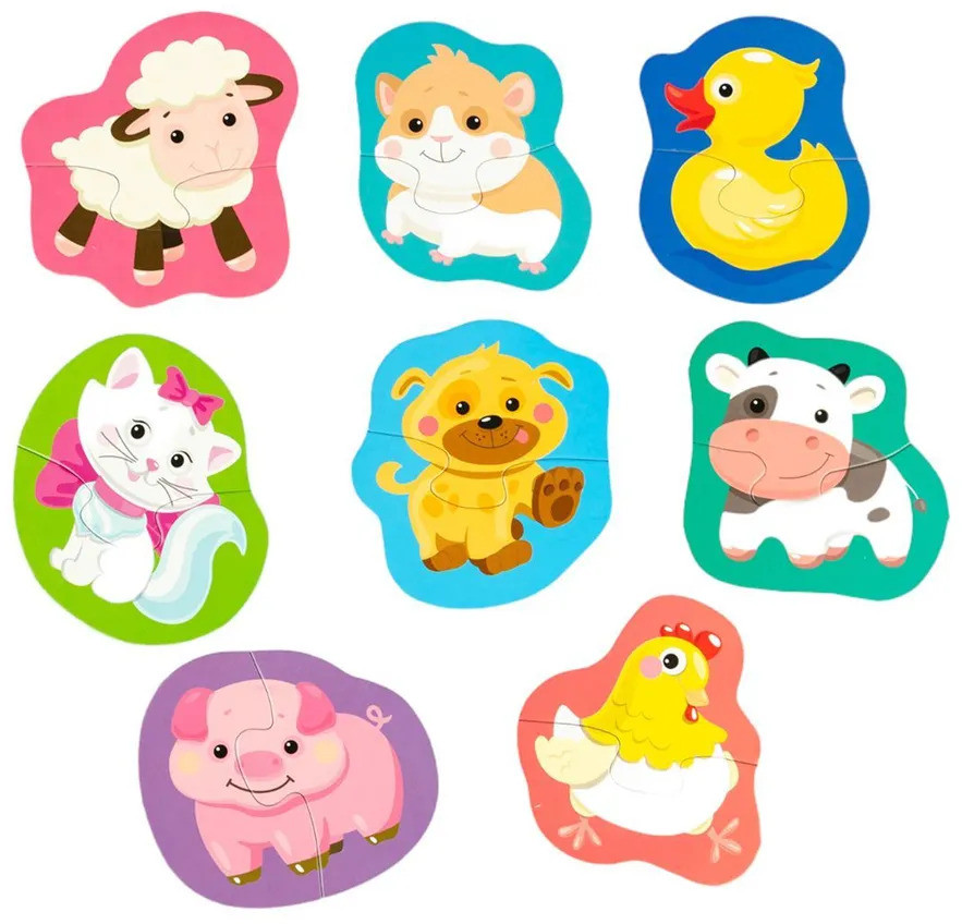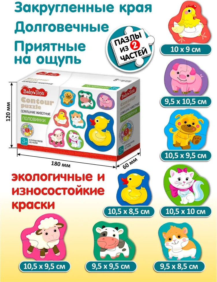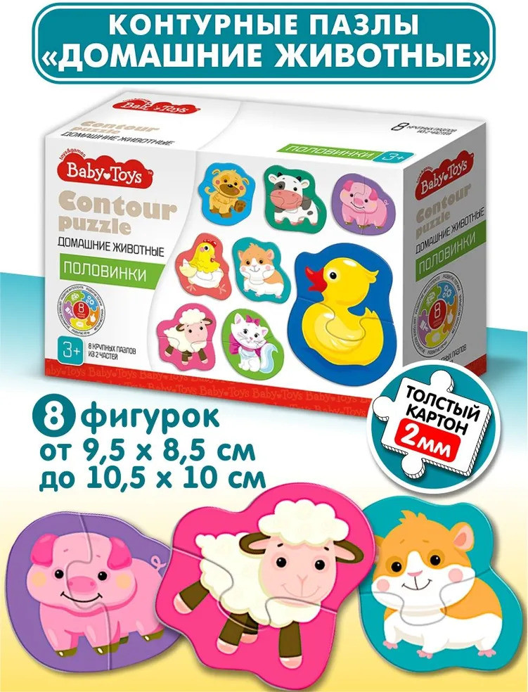 💳 Оплатить за товар можно при получении 🇰🇿 Есть бесплатная доставка по Казахстану от 1 дня 🎁 Копите бонусы с каждой покупки Контурные пазлы-половинки «Домашние животные» — первые пазлы для вашего малыша, каждый из которых состоит из 2 крупных деталей. С набором контурных пазлов-половинок «Домашние животные» малыш сможет собрать фигурки 8 питомцев: утёнка, свинью, корову, собачку, курочку, хомячка, овечку и кошку. Каждая фигурка состоит из 2 частей, что позволяет научить ребёнка находить половинки картинок, разбитых на части. |