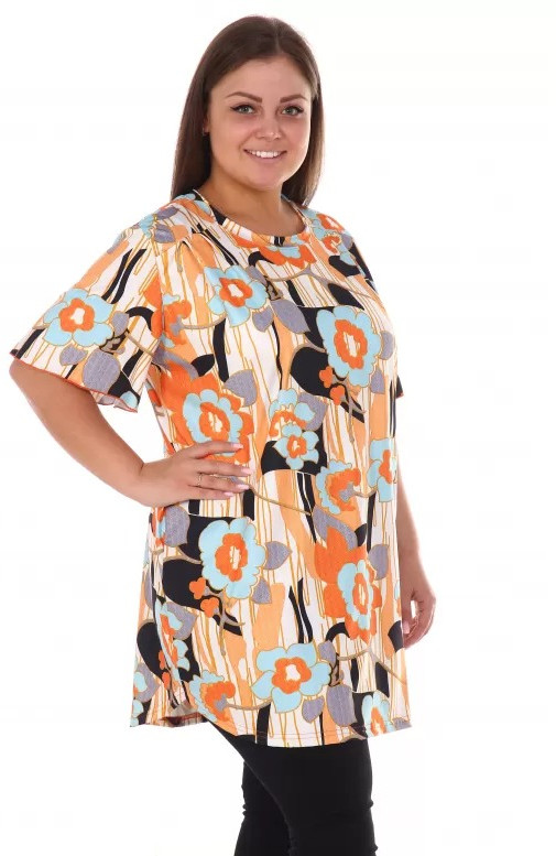 От туники я в восторге, нигде не обтягивает. Специально брала размер побольше свободная как сейчас модно оверсайз. Длинна нормальная все прикрывает. На лето вообще прекрасно.