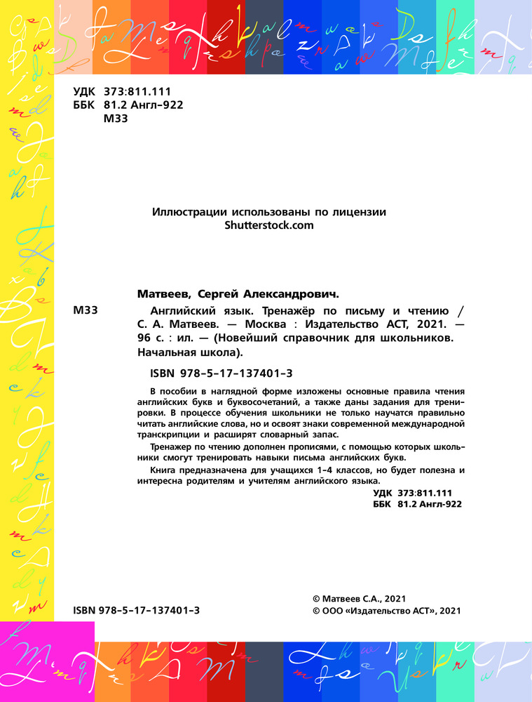 Английский язык. Тренажер по письму и чтениюВ данный момент этот товар отсутствует в продаже. Возможно, у нас найдется аналогичный или похожий товар здесь. Серия: Новейший справочник для школьников. Начальная школа В пособии в наглядной форме изложены основные правила чтения английских букв и буквосочетаний, а также даны задания для тренировки. В процессе обучения школьники не только научатся правильно читать английские слова, но и освоят знаки современной международной транскрипции и расширят словарный запас. |