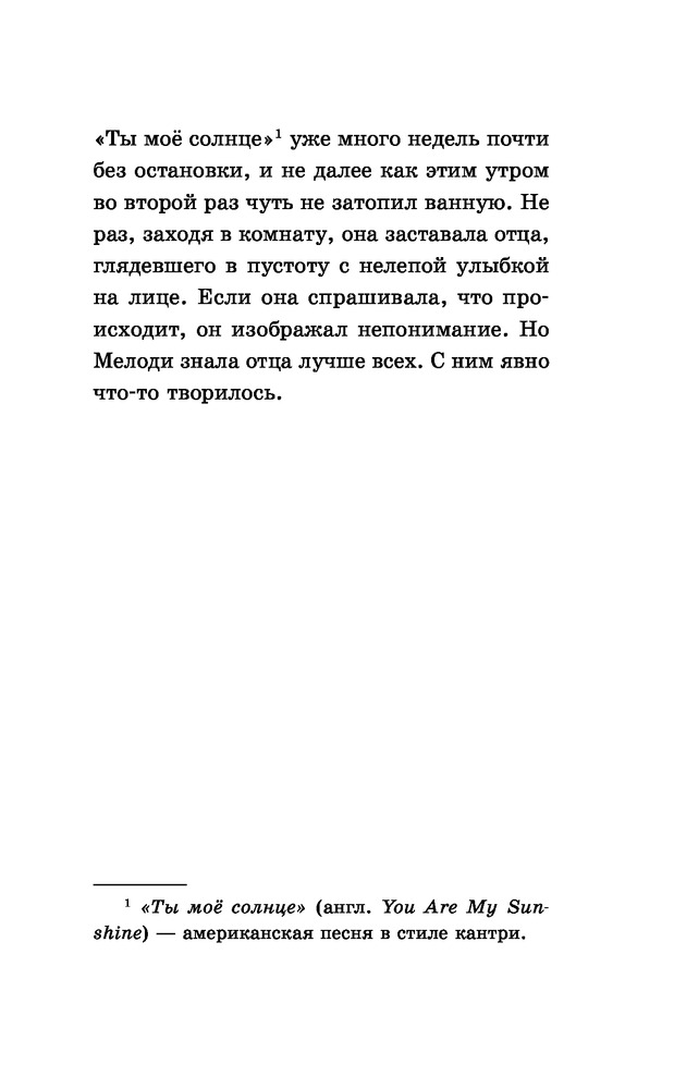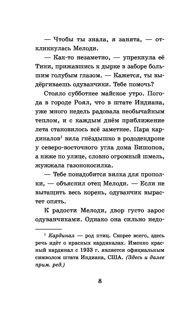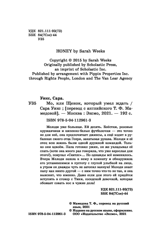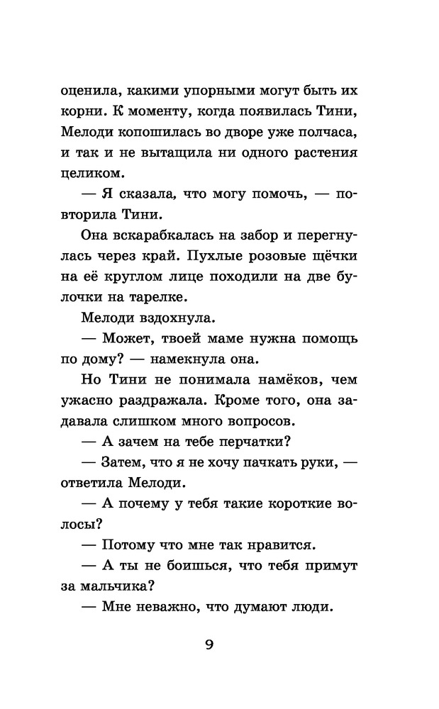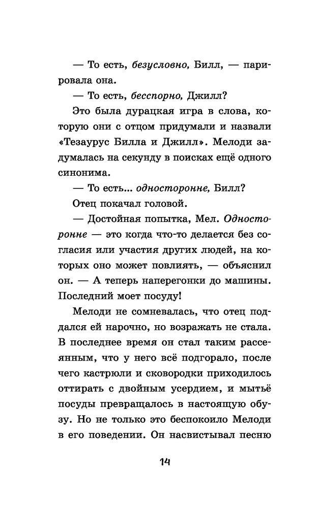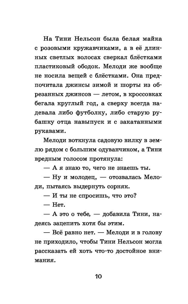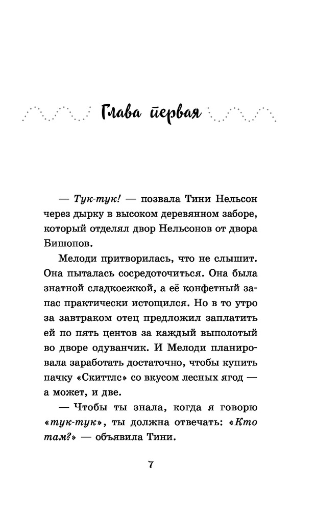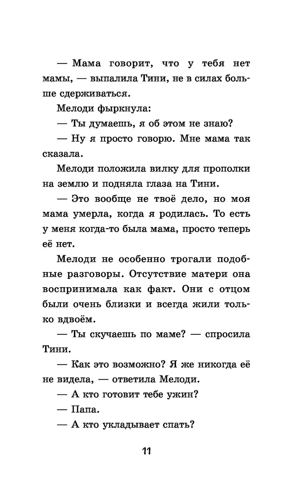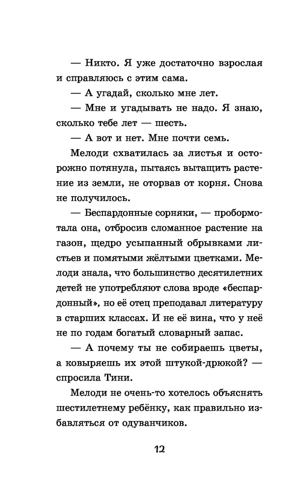 Мо, или щенок, который умел ждать. Выпуск 2В данный момент этот товар отсутствует в продаже. Возможно, у нас найдется аналогичный или похожий товар здесь. Серия: Счастье не в пирогах. Проза для подростков Мелоди уже большая. Ей десять. Блёстки, розовые кружавчики и кипенно-белые футболочки — это точно не для неё, она предпочитает джинсы, а ещё ходит в рубашках своего отца Генри, закатывая рукава. Мелоди и её отец всю жизнь были одной дружной командой. Только они вдвоём. Папа готовил ужин, он же укладывал её спать (хотя она много раз говорила, что уже взрослая для этого!), покупал «Скитлс»... Но однажды всё изменилось. Вчера Мелоди зашла к нему в комнату и обнаружила его, уставившимся в пустоту с глупой улыбкой на лице, а утром он дважды чуть не затопил ванную! Мелоди знает папу как никто другой — с ним точно что-то не так, и она выяснит, что именно. Даже, если для этого ей придётся вступить в сговор с Тини, соседской девочкой, которая обожает совать нос в чужие дела! |
