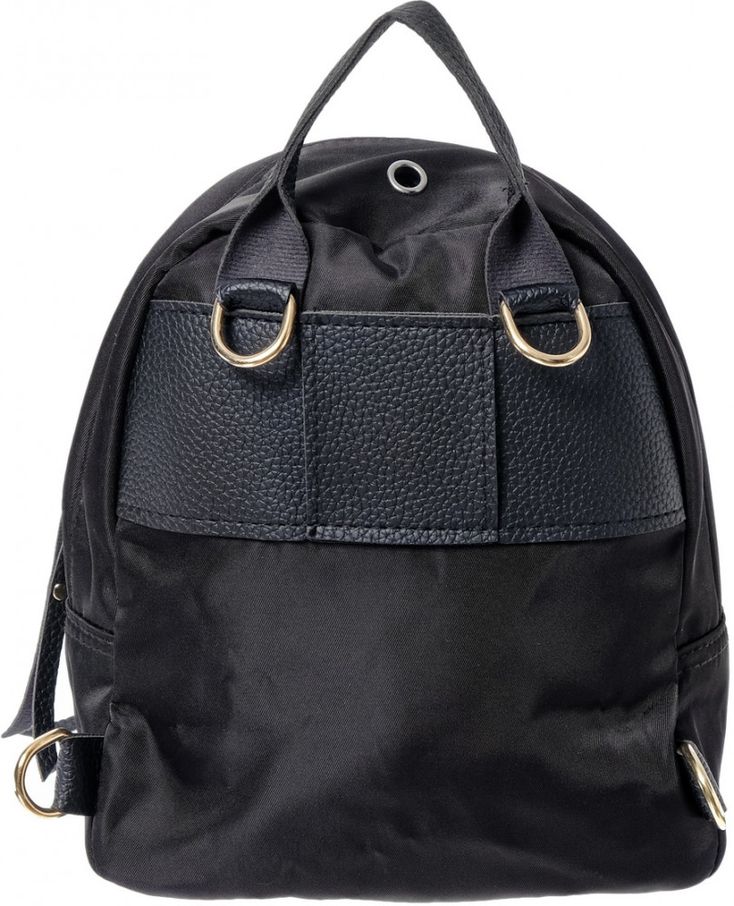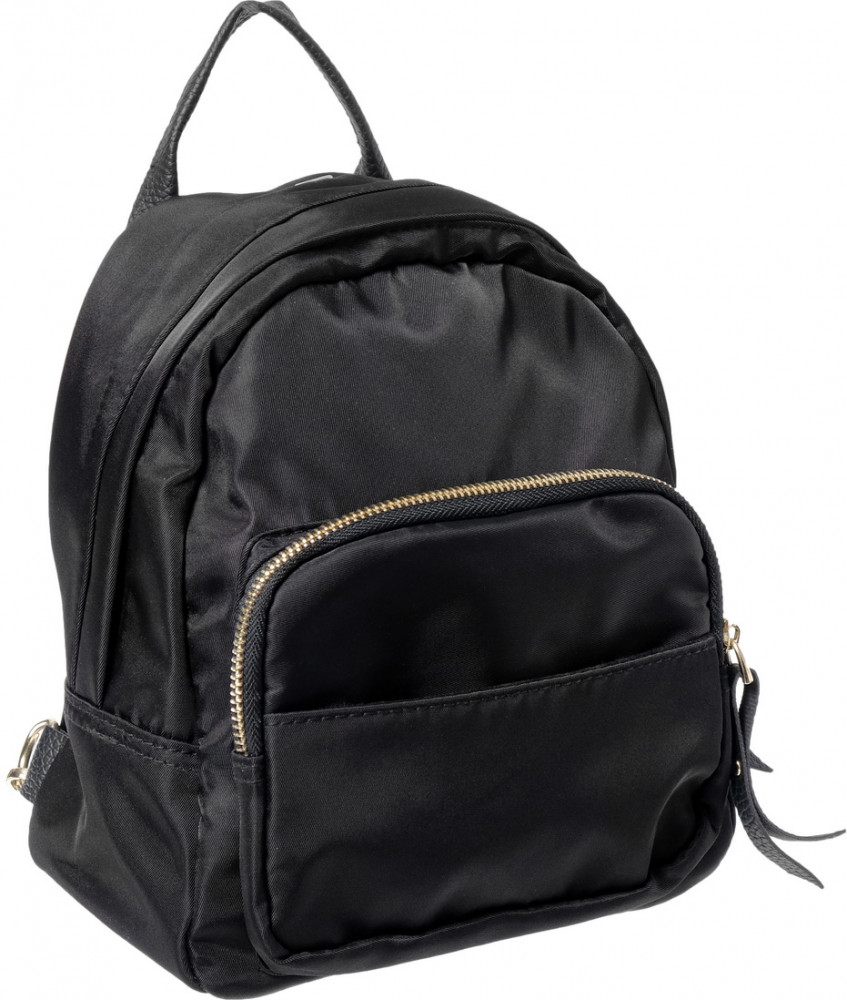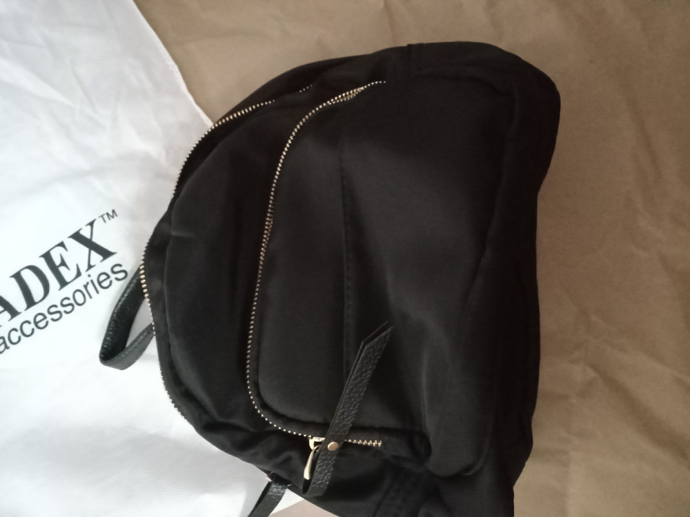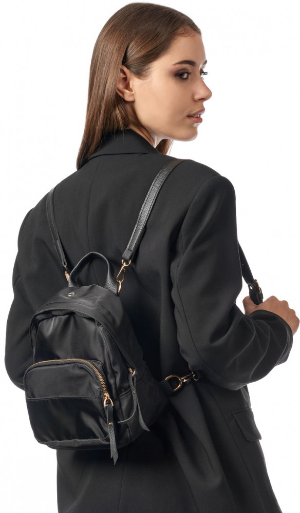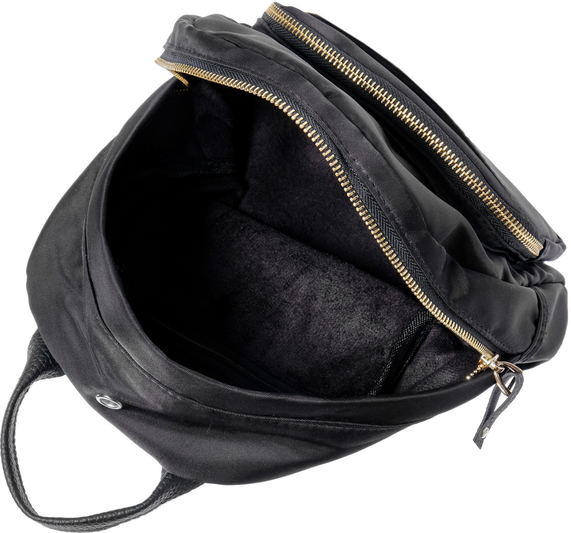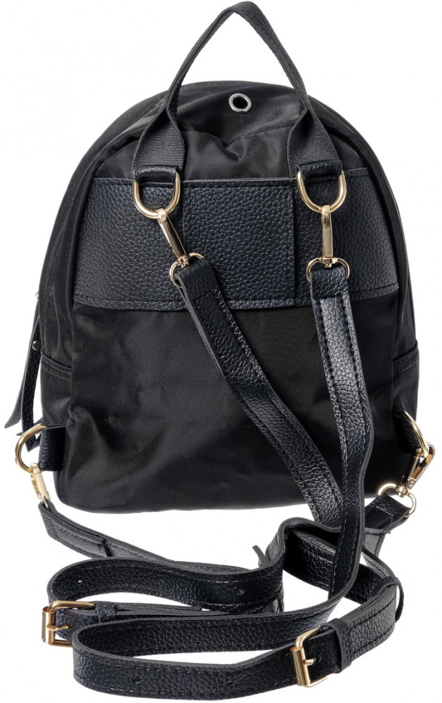 Размер рюкзака маленький для поездок в другой город. Но хорош для походов по городу, в кафе, магазин. В него поместится косметичка, кошелек, пакеты для покупки и так по мелочи. Нейлон на черном велюровом подкладе, фурнитура золотая. Запах от материала изделия за 2 дня выветривания на балконе не сильно улетучился. Лямки выполнены из искусственной кожи- прослужат не долго. В уходе прост, достаточно протереть влажной тряпкой. Украшением черного рюкзака служит золотая фурнитура.