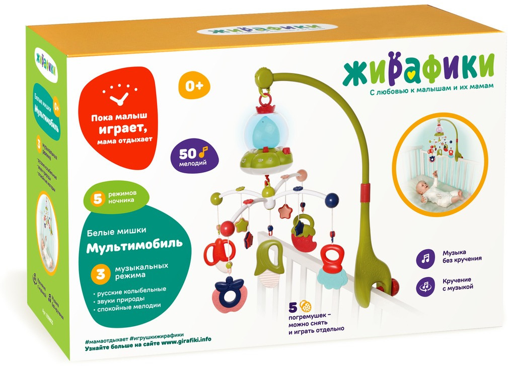 В данный момент этот товар отсутствует в продаже. Возможно, у нас найдется аналогичный или похожий товар здесь. Мультифункциональный мобиль «Белые мишки» работает в 3-х музыкальных режимах: русские колыбельные, звуки природы и спокойные мелодии. К мобилю крепятся 5 красочных подвесных игрушек-погремушек, которые будут привлекать внимание малыша и побуждать его к двигательной активности. Сначала кроха будет с интересом разглядывать их, а затем начнёт тянуться к этим привлекательным игрушкам ручками и ножками, развивая таким образом хватательный рефлекс, моторику и внимание.