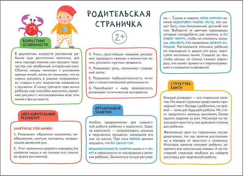 💳 Оплатить за товар можно при получении 🇰🇿 Есть бесплатная доставка по Казахстану от 1 дня 🎁 Копите бонусы с каждой покупки Книга «Рисуем карандашами 2+» из серии «Школа Семи Гномов. Мастерская» — это красочный альбом для занятий рисованием с ребенком от 2 до 3 лет. Занятия на близкие и понятные ребенку темы расположены по мере усложнения: поступательно переходя от освоения простых навыков к более сложным заданиям, ребенок научится создавать рисунки с помощью карандашей или фломастеров. |