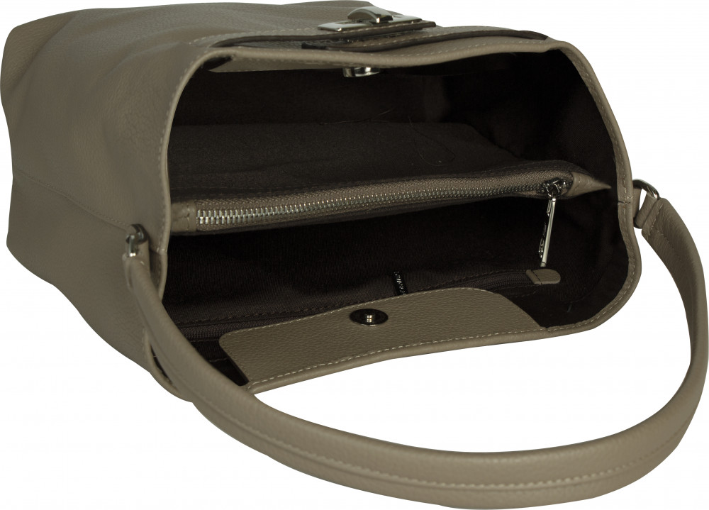 Модная вместительная сумка из натуральной кожи. Одно отделение закрывается на магнитную кнопку. Внутри карман-перегородка на молнии, также имеется карман на молнии на задней стенке и открытый карман на передней стенке. Высота основной ручки 22 см. В комплекте ремень для ношения на плече, пристегивается при помощи карабинов, регулируется по длине от 113 до 130 см. На лицевой стороне сумки декоративнвй ремешок с металлическим замочком.