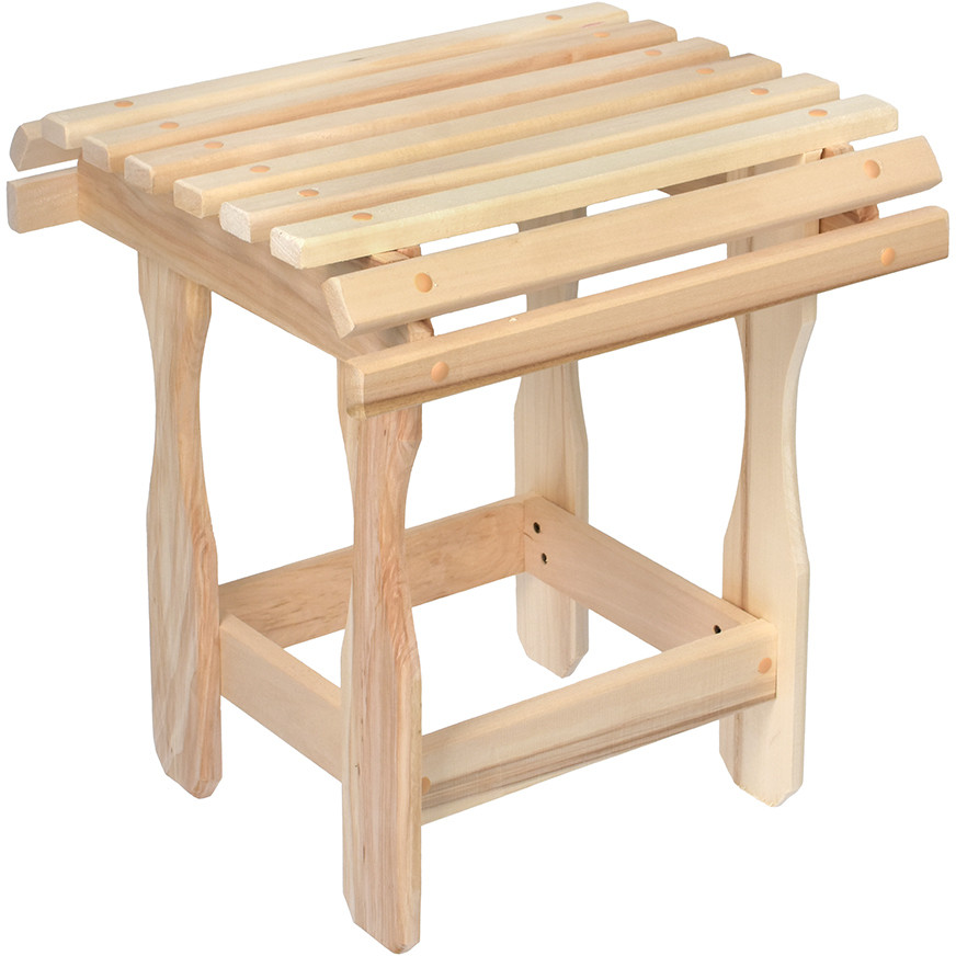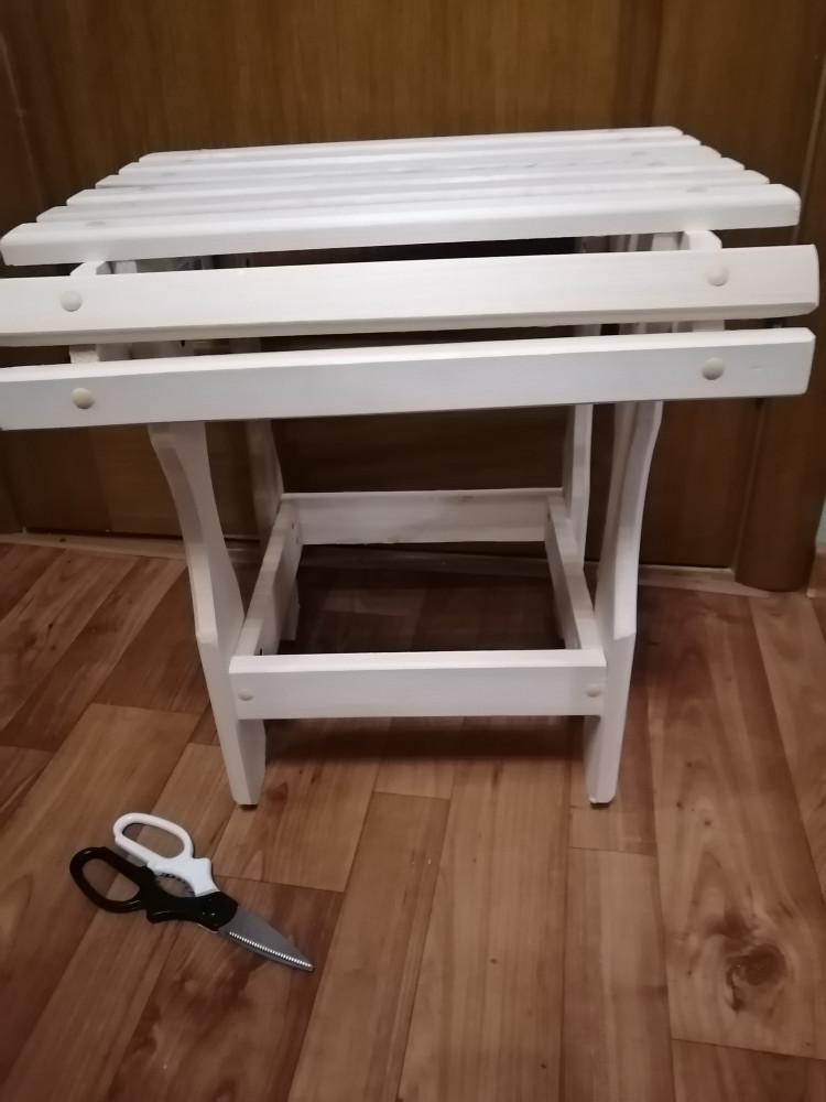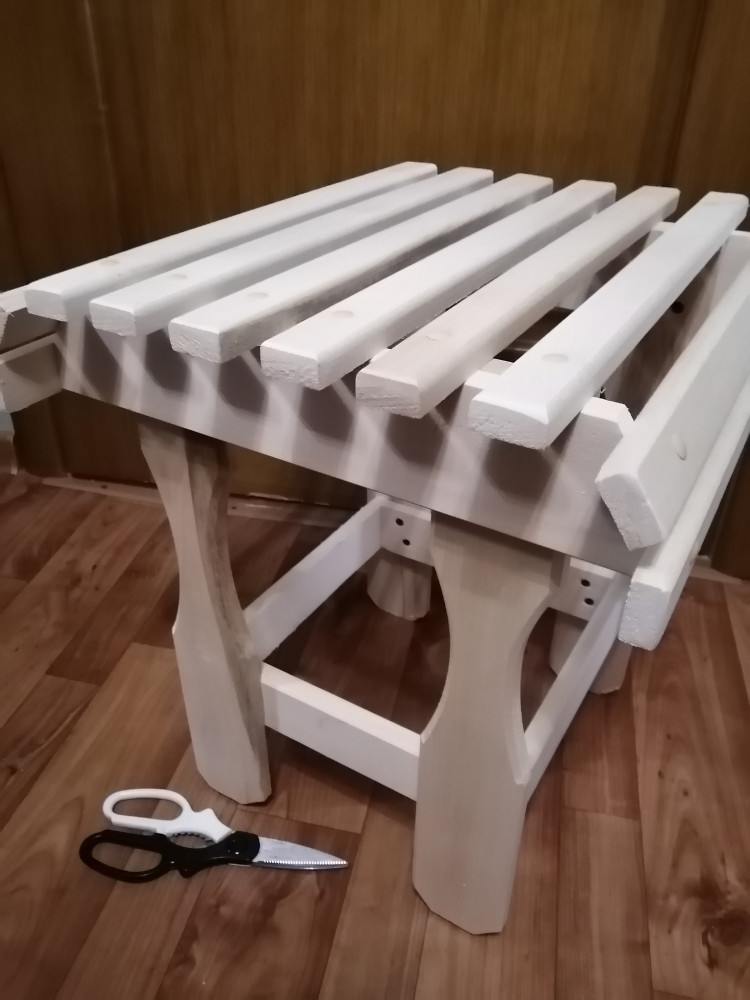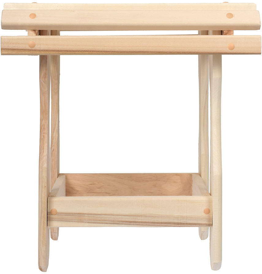 Компактный и удобный табурет. Легко помещается в шкафу или в багажнике автомобиля. Занимает мало места при хранении. Удобен в бане, на даче, в квартире. Изготовлен из липы.
