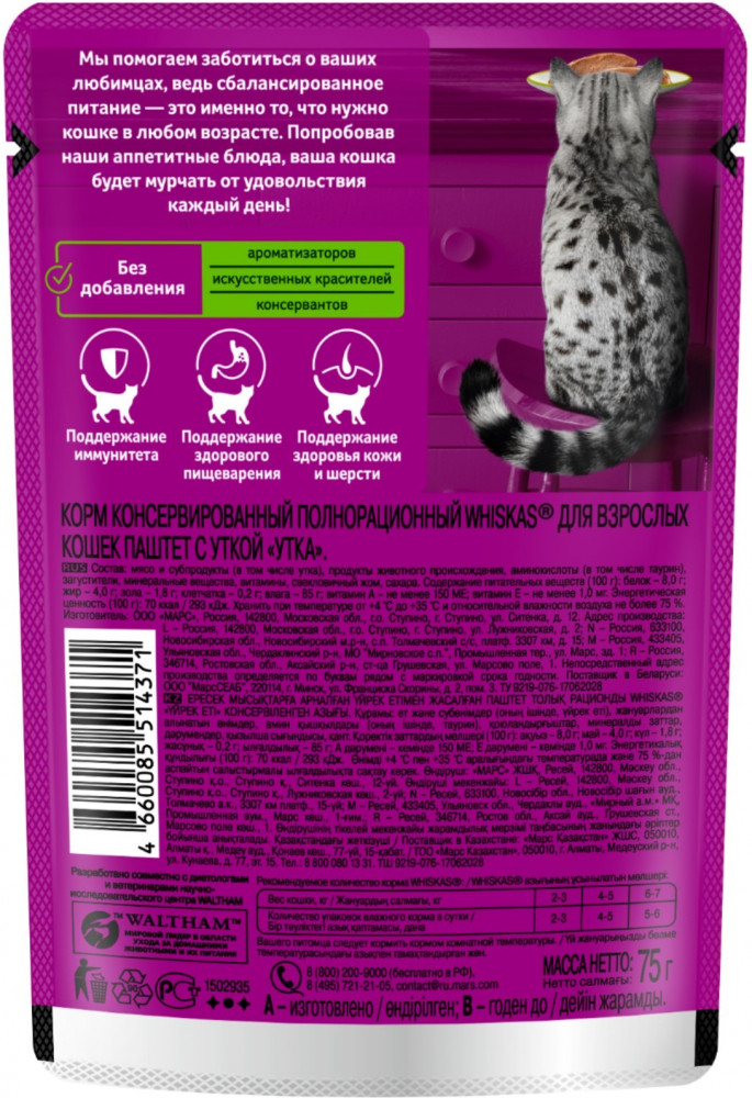Whiskas Корм для кошек влажный «Паштет с уткой»