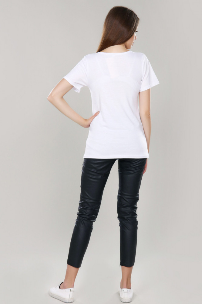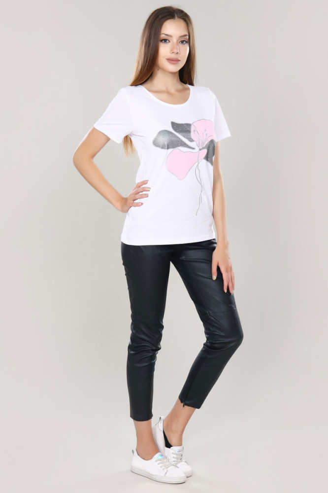 Рукав втачной, хорошо сел. После стирки футболка слегка села. Рисунок принта стильный и нежный, но краска жёсткая на ощупь, с кожаным блеском, совсем не сочетается с мягкой тканью футболки. Хотелось бы такую же модель, но с мягким принтом, пусть подороже.