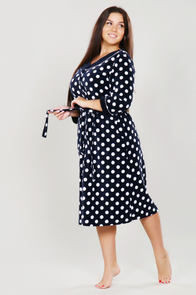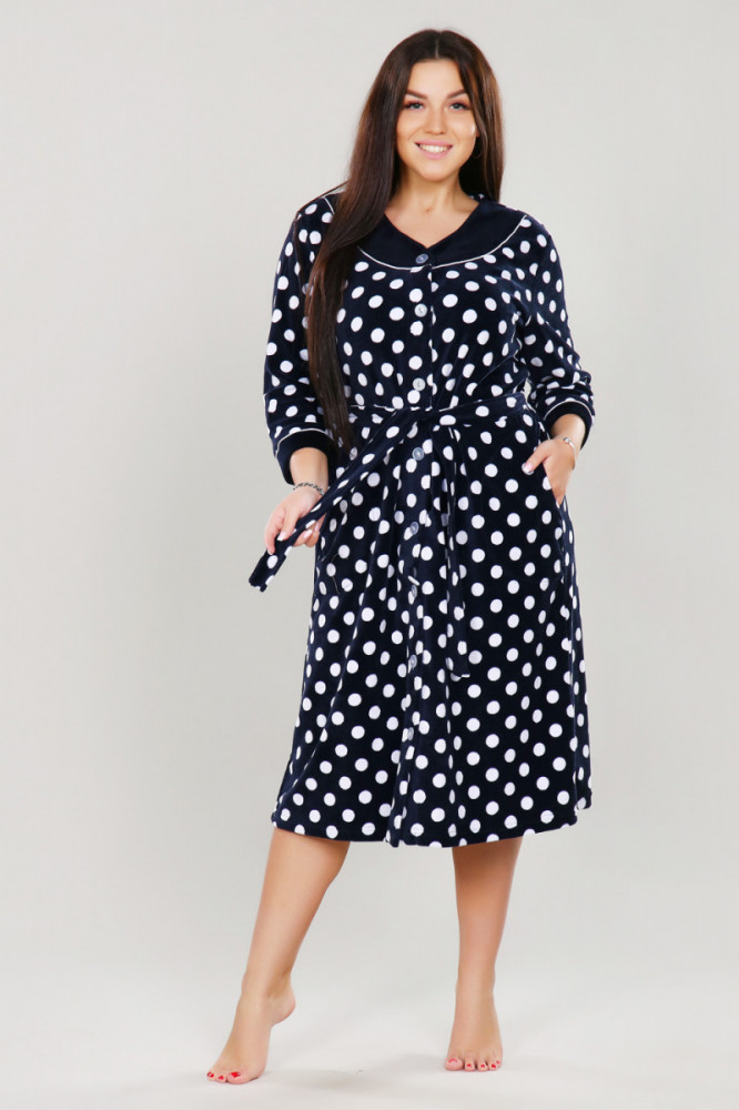 теплый, уютный халат, на пуговицах - то, что искала, и размер подошел. Расцветка - горох - сейчас в тренде