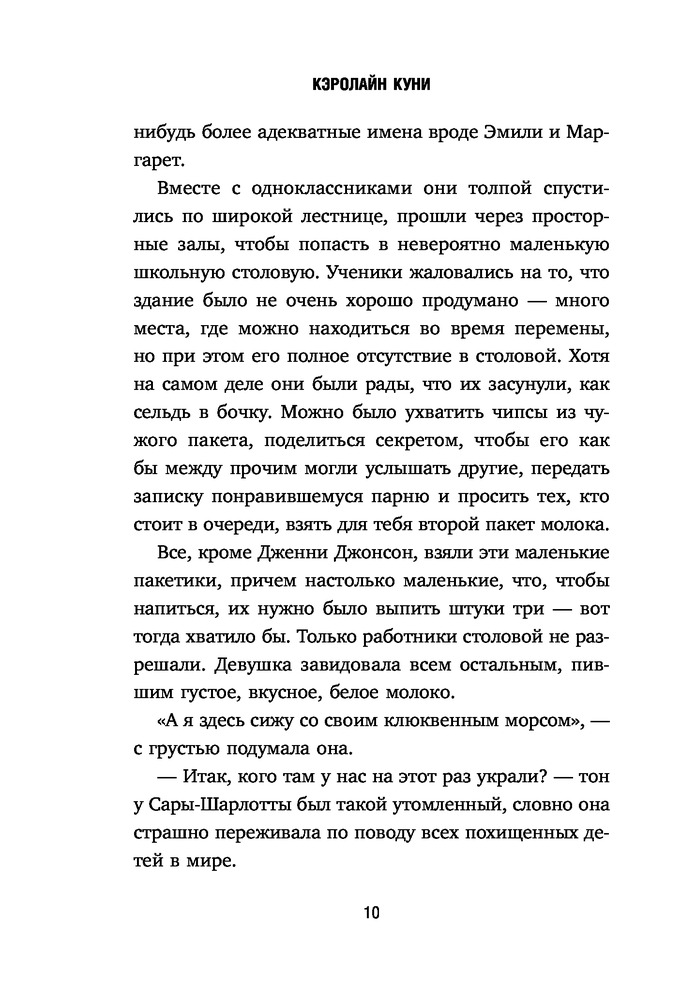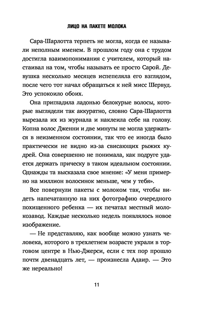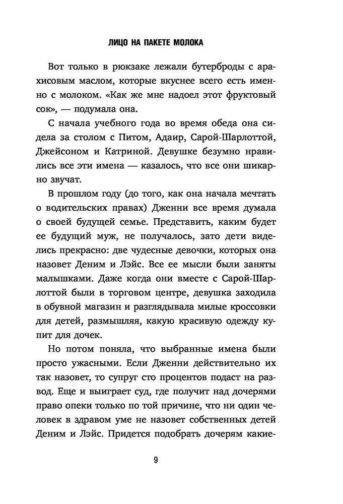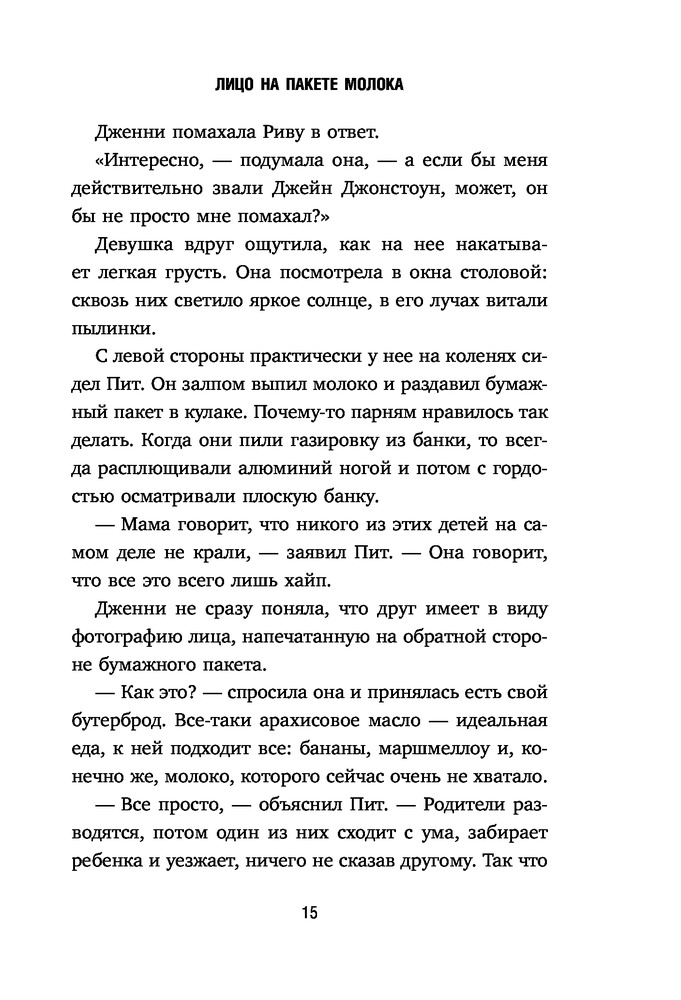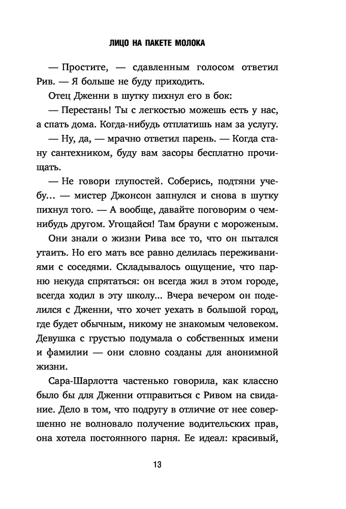 Лицо на пакете молокаВ данный момент этот товар отсутствует в продаже. Возможно, у нас найдется аналогичный или похожий товар здесь. Серия: MOLOKO. Кто-то разыскивает тебя по всей стране Дженни — самая обычная девочка-подросток. Она ходит в школу, болтает по телефону с подружками, влюблена в соседского парня. У нее идеальный дом и любящие родители. Но однажды она видит изображение пропавшей девочки на коробке молока и узнает в ней себя... Вся ее жизнь теперь кажется ей обманом. Она не верит, что ее родители способны похитить ребенка. Но почему тогда ей не показывают свидетельство о рождении, в доме нет детских фотографий, а внешне она совсем не похожа на маму с папой? Ей предстоит выбрать — притвориться, что ничего не произошло и забыть обо всем или разгадать эту загадку и узнать всю правду о своем прошлом. |