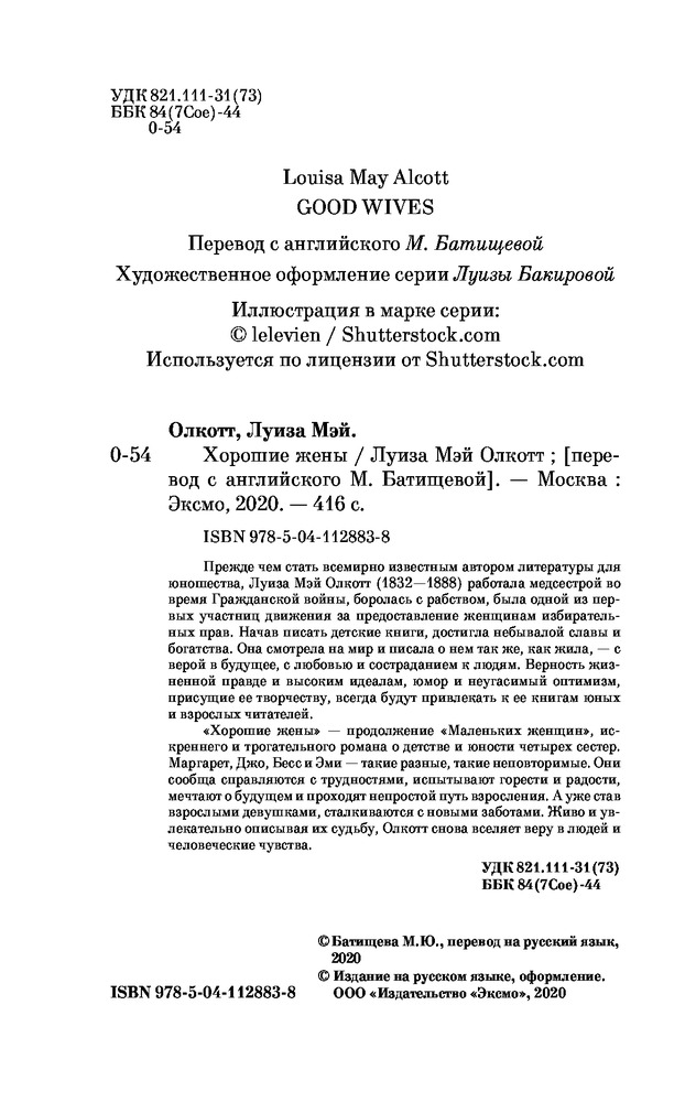 Хорошие женыВ данный момент этот товар отсутствует в продаже. Возможно, у нас найдется аналогичный или похожий товар здесь. Серия: Белая птица Прежде чем стать всемирно известным автором литературы для юношества, Луиза Мэй Олкотт (1832-1888) работала медсестрой во время Гражданской войны, боролась с рабством, была одной из первых участниц движения за предоставление женщинам избирательных прав. Начав писать детские книги, достигла небывалой славы и богатства. Она смотрела на мир и писала о нем так же, как жила, — с верой в будущее, с любовью и состраданием к людям. Верность жизненной правде и высоким идеалам, юмор и неугасимый оптимизм, присущие ее творчеству, всегда будут привлекать к ее книгам юных и взрослых читателей. |