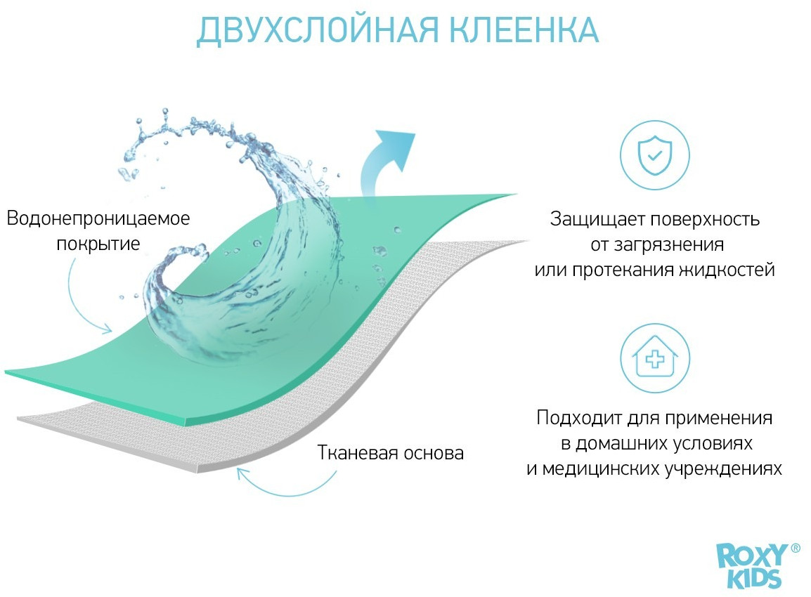 Клеенка подкладная защищает детские матрасы и любую другую поверхность от загрязнения или протекания жидкостей. Изделие производится из специальной медицинской клеенки с ПВХ-покрытием. Все клеенки имеют окантовку по периметру. Они обладают отличной теплопроводностью. Специальный покрывающий слой на основе поливинилхлорида делает поверхность пеленок удобной и комфортной — она быстро приобретает температуру человеческого тела. Отсутствует так называемый «эффект холодного прикосновения», что очень важно в педиатрии. Микропористая структура данного покрытия придает клеенке свойства газопроницаемости.