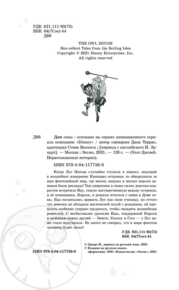 Дом совыВ данный момент этот товар отсутствует в продаже. Возможно, у нас найдется аналогичный или похожий товар здесь. Серия: Детск. Уолт Дисней. Нерасcказанные истории Когда Лус Носеда случайно ступила в портал, ведущий в волшебное измерение Кипящих островов, то обнаружила за ним фэнтезийный мир, где магия, ведьмы и милые короли демонов были реальны! Там уверенная в своих силах девочка-подросток встретила Иду, самую могущественную ведьму островов, и её помощника, Короля, и решила остаться с ними в Доме совы. Ида согласилась принять Лус как свою ученицу, но оттого что девочка не обладала магической силой с рождения, ей пришлось особенно усердно трудиться, чтобы овладеть волшебным ремеслом. С необычными уроками Иды, поддержкой Короля и помощью новых друзей — Эмити, Уиллоу и Гуса, у Лус даже стало получаться. Но никто не говорил, что в мире фэнтези человеку будет легко! |