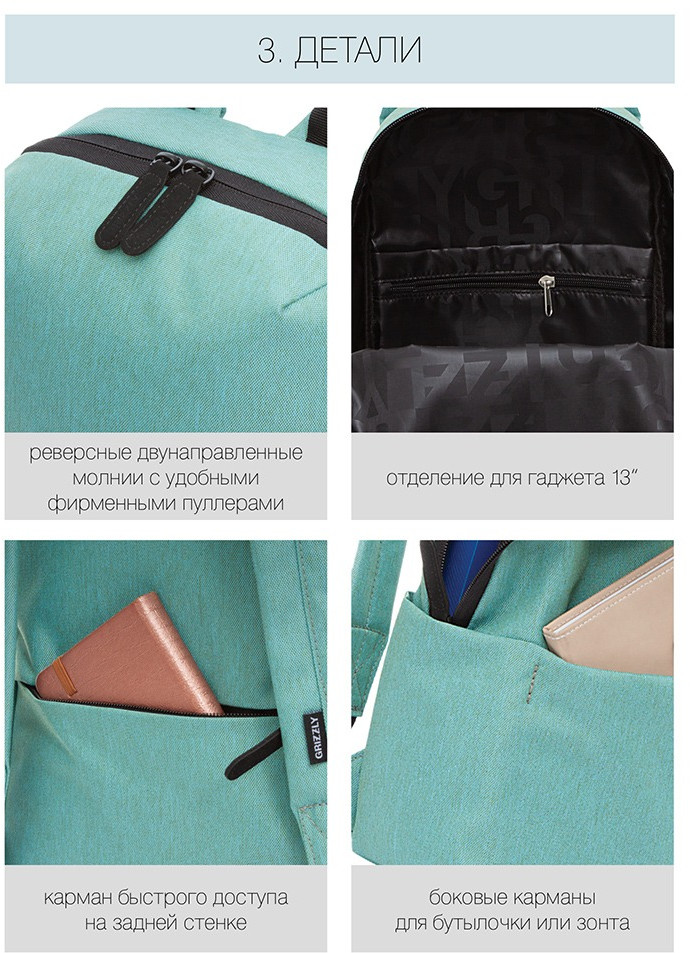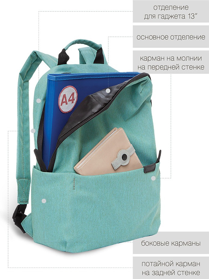 Стильный и легкий городской рюкзак для прогулок и путешествий, отдыха и спорта, работы и магазина, школы и института. Этот эргономичный городской рюкзак продуман до мелочей. Он имеет одно вместительное основное отделение с карманом для планшета или ноутбука 13″. У рюкзака есть карман на молнии спереди, потайной карман сзади, удобная укрепленная спинка, регулируемые мягкие лямки. Материал рюкзака с водо- и грязеотталкивающей пропиткой. Двунаправленные реверсные молнии с брендированными пуллерами на замках позволяют легко открывать и закрывать рюкзак. Рюкзак имеет прочную и грязеотталкивающую фирменную подкладку.
