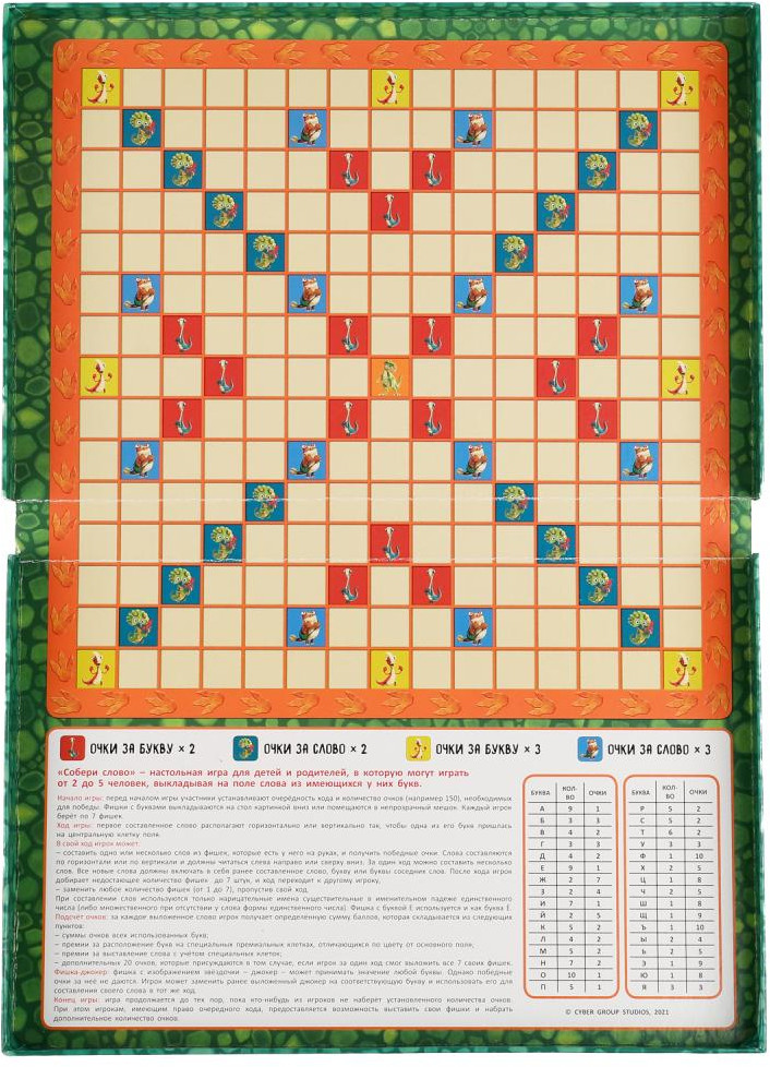 С этой весёлой настольной игрой ребёнку предстоит погрузиться в увлекательный процесс составления слов. Игра будет очень творческой, и вместе с тем потребует от игроков продемонстрировать логические навыки и стратегическое мышление. Именно поэтому она подходит для игроков любого возраста и быстро увлечёт и взрослых, и детей. Благодаря компактным размерам игру удобно брать с собой.