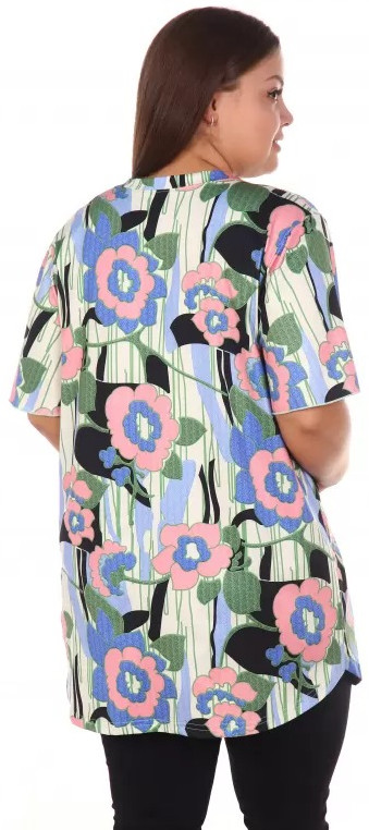 От туники я в восторге, нигде не обтягивает. Специально брала размер побольше свободная как сейчас модно оверсайз. Длинна нормальная все прикрывает. На лето вообще прекрасно.