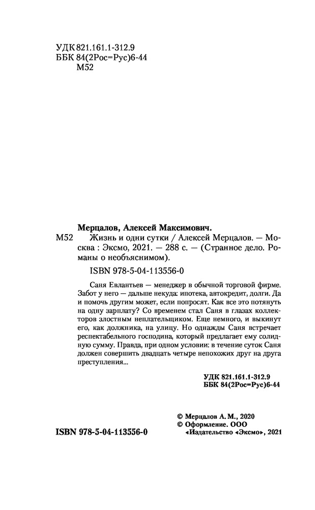Серия: Странное дело. Романы о необъяснимом Саня Евлантьев — менеджер в обычной торговой фирме. Забот у него — дальше некуда: ипотека, автокредит, долги. Да и помочь другим может, если попросят. Как все это потянуть на одну зарплату? Со временем стал Саня в глазах коллекторов злостным неплательщиком. Еще немного, и выкинут его, как должника, на улицу. Но однажды Саня встречает респектабельного господина, который предлагает ему солидную сумму. Правда, при одном условии: в течение суток Саня должен совершить двадцать четыре непохожих друг на друга преступления... |