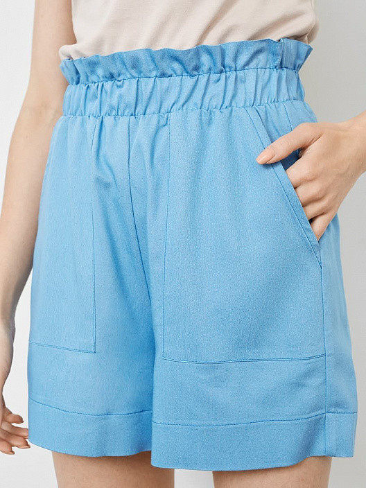 Текстильные шорты длиной выше колен, прямые и свободные, с высокой линией талии. Спереди имеются накладные карманы. Присборенный пояс с эластичной тесьмой внутри. Рекомендуем эту модель!