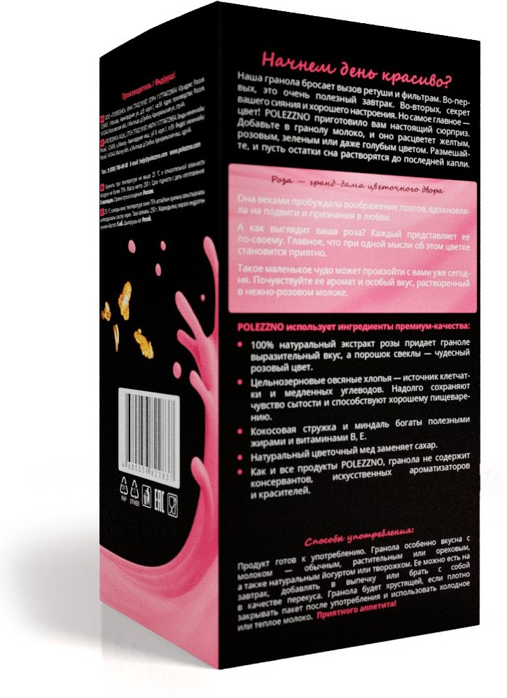 Наша гранола бросает вызов ретуши и фильтрам. Во-первых, это очень полезный завтрак. Во-вторых, секрет вашего сияния и хорошего настроения. Но самое главное — цвет! Polezzno приготовило вам настоящий сюрприз. Добавьте в гранолу молоко, и оно расцветет желтым, розовым, зеленым или даже голубым цветом. Размешайте, и пусть остатки сна растворятся до последней капли.